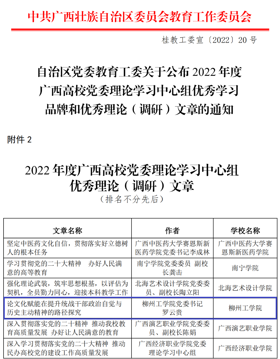 日前,开云党委理论学习中心组理论文章《论文化赋能在提升统战干部政治自觉与历史主动精神的路径探究》获评2022年度广西高校党委理论学习中心组优秀理论(调研)文章。