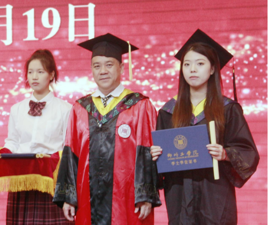 校长助理黄哲春宣读表彰文件。副校长梁开庆为2025年考取硕士研究生的学生代表颁发荣誉证书。黄哲春为获得2025年“优秀毕业生”荣誉称号的学生代表颁发荣誉证书。