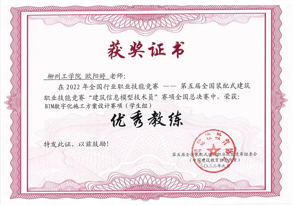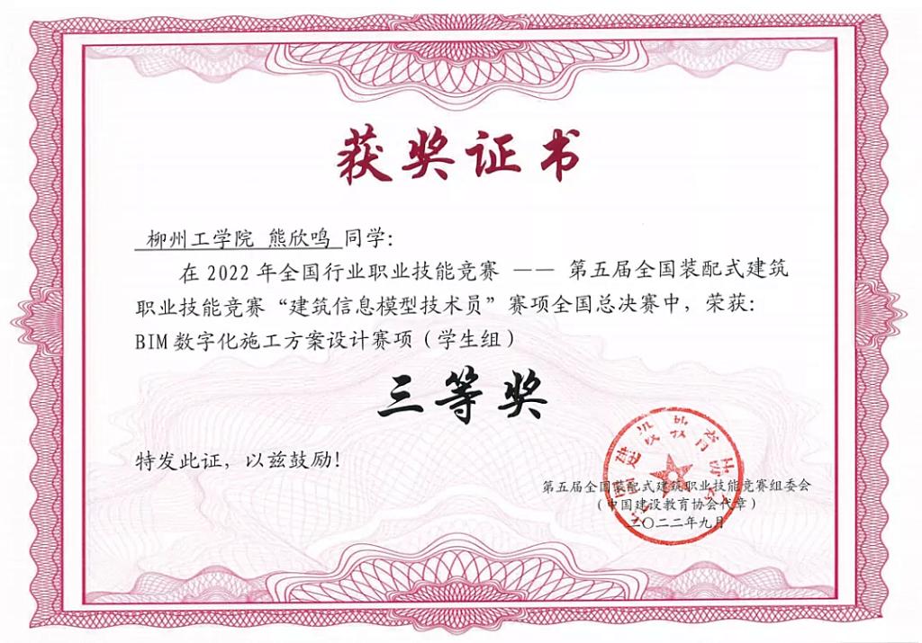 2022年全国行业职业技能竞赛——第五届全国装配式建筑职业技能竞赛“建筑信息模型技术员”赛项(学生组)全国总决赛采取线上方式举办,来自全国各省的参赛队伍展开激烈角逐。此次竞赛中,在欧阳婷老师的指导下,熊欣鸣同学在广西区选拔赛中脱颖而出,以“BIM数字化施工方案设计赛项”全区第一名的好成绩,代表广西区参加2022年全国行业职业技能竞赛——第五届全国装配式建筑职业技能竞赛“建筑信息模型技术员”赛项全国总决赛,并斩获佳绩。