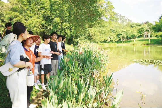 龙潭公园水系属柳江一级支流,其生态修复工程在流域保护与城市生态建设方面具有典型的示范价值和重要的研究意义。当天,由市政院公司和龙潭公园组成的讲师团队,分别在雷潭、镜湖、S弯等景点,为学生现场讲解水生态系统的情况,指导学生观察水生植物的分布差异,分析不同水位的生态治理策略和修复方案。