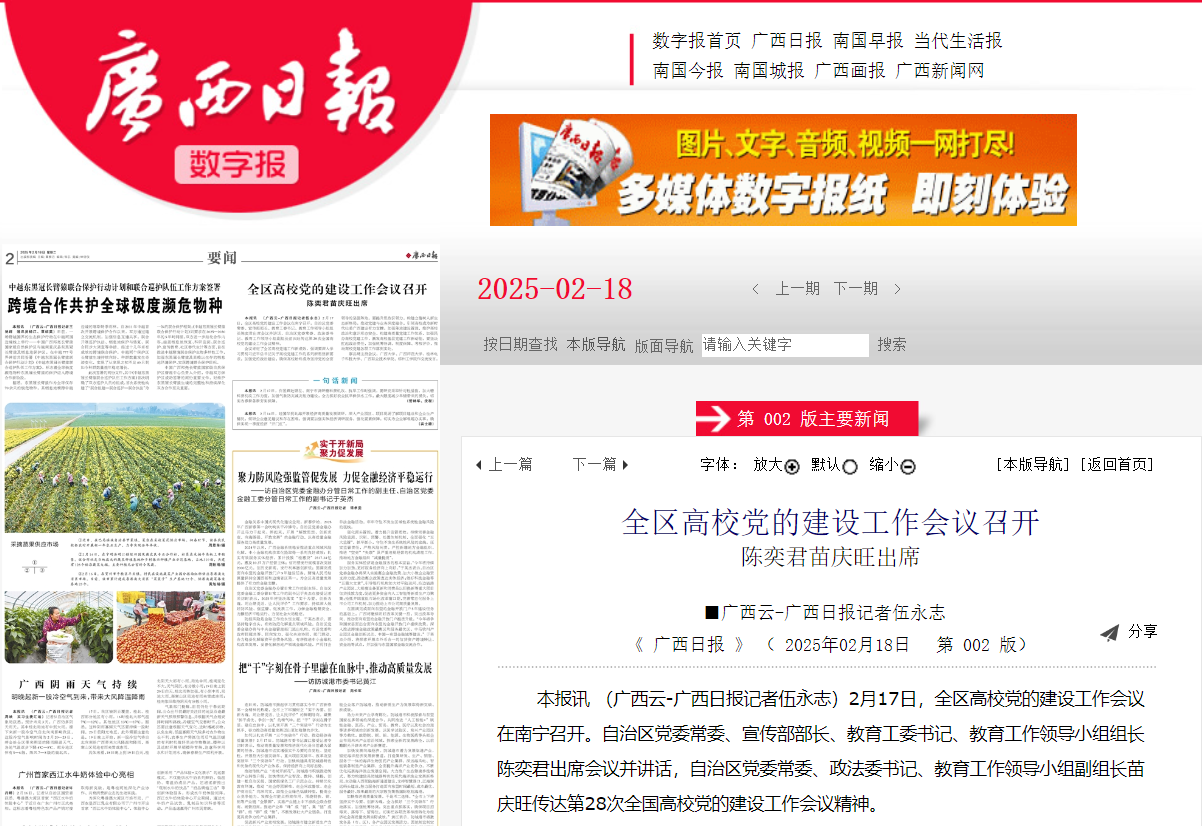 1.《广西日报》:全区高校党的建设工作会议召开 陈奕君苗庆旺出席