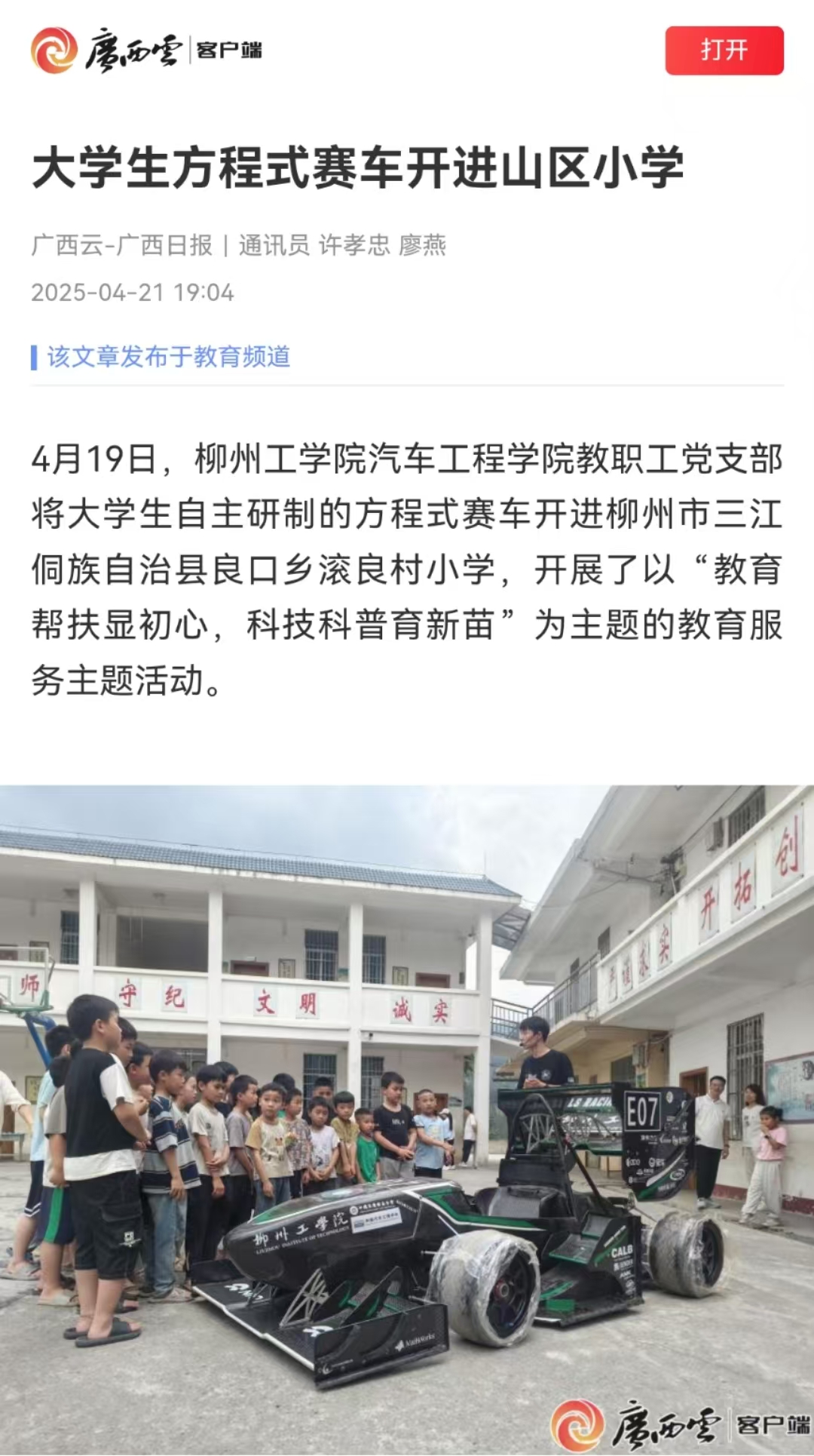 4月19日,开云kaiyun官方网站汽车工程学院教职工党支部将大学生自主研制的方程式赛车开进柳州市三江侗族自治县良口乡滚良村小学,开展了以“教育帮扶显初心,科技科普育新苗”为主题的教育服务主题活动。这一举措受到了广西云-广西日报客户端的关注报道,一起来看看吧!