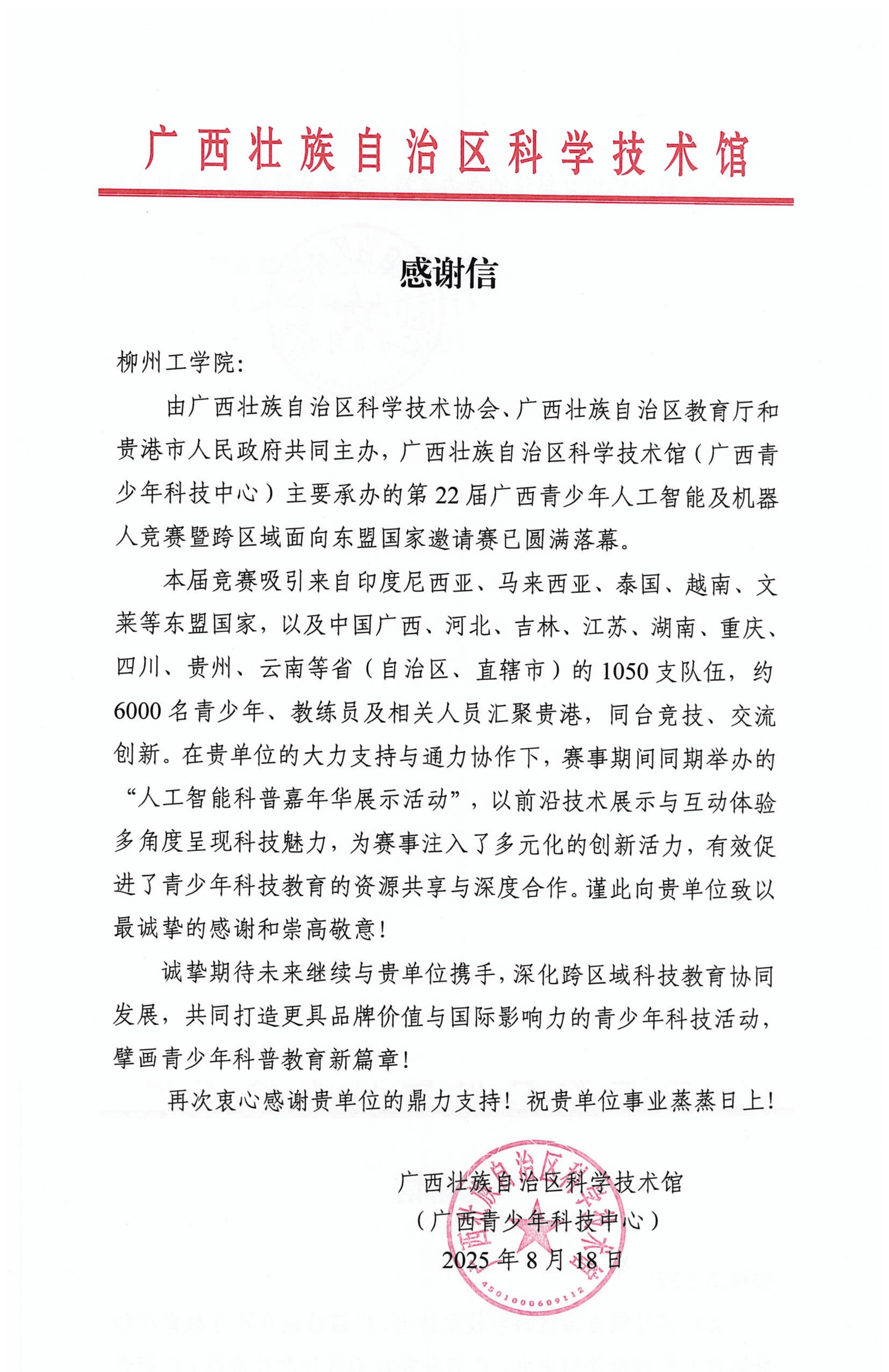 近日,广西壮族自治区科学技术馆(广西青少年科技中心)给开云发来感谢信,感谢开云在2025年广西人工智能科普嘉年华展示活动中助力青少年科普教育,为赛事注入创新活力。
