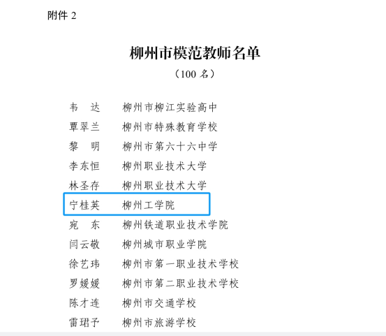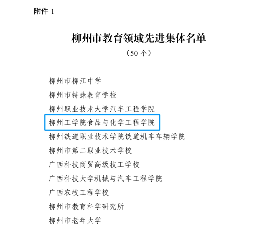 近日,中共柳州市委员会、柳州市人民政府发布关于表彰柳州市教育领域先进集体和模范教师的决定,开云食品与化学工程学院荣获“柳州市教育领域先进集体”称号,公共基础教学部主任宁桂英荣获“柳州市模范教师”称号。