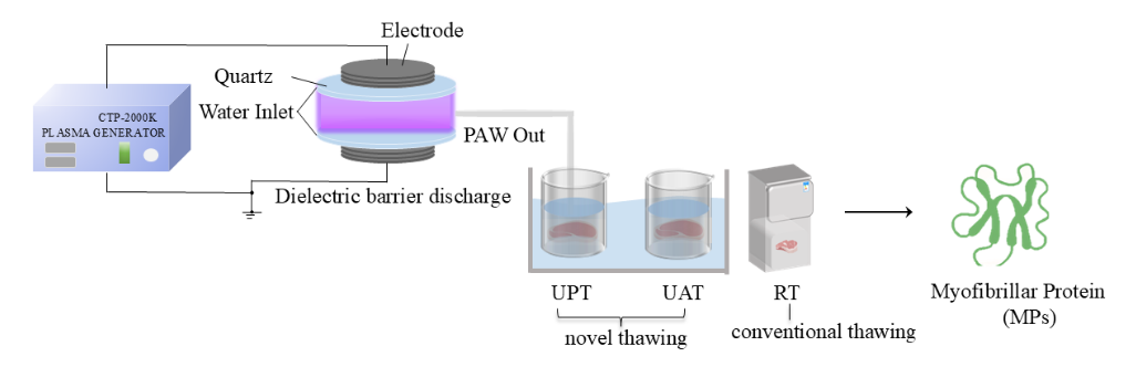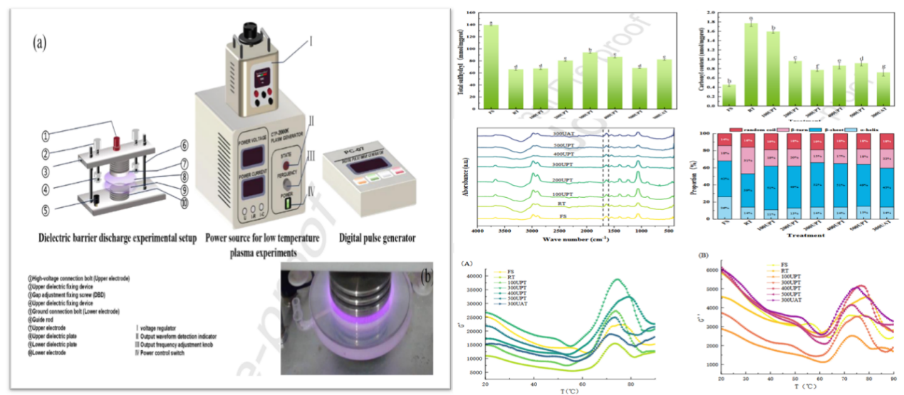 本论文聚焦生鲜肉新型解冻技术研究,旨在探讨等离子体活化水作结合超声波处理对羊肉肌原纤维蛋白理化特性、氧化程度及结构的影响。通过总巯基(T-SH)、羰基含量和表面疏水性指标发现,300UPT处理能有效抑制蛋白质氧化;差示扫描量热仪与流变学特性分析表明,300UPT与400UPT处理可有效防止蛋白质聚集并维持其热稳定性;SDS-PAGE结果显示,超声波结合等离子体活化水解冻未改变羊肉肌原纤维蛋白的条带模式。总之,与传统解冻、单一超声波水解冻相比,新型组合解冻方式展现出与新鲜样品相当的解冻效果。