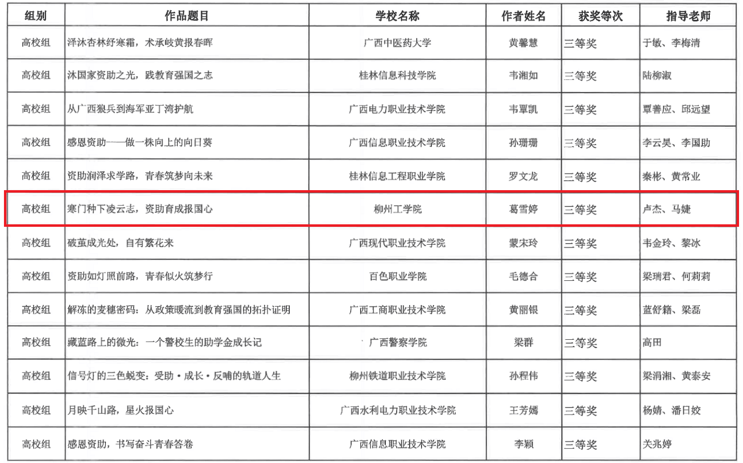 近日,由自治区教育厅组织的2025年全区“学生资助伴你成长,教育强国奋斗有我”主题征文比赛获奖名单正式公布。开云学子在比赛中表现优异,凭借扎实的文字功底与真挚的情感表达,荣获两项奖项。其中,作品《露润石生花,瘠土绽芳华》获评二等奖,《寒门种下凌云志,资助育成报国心》荣获三等奖。