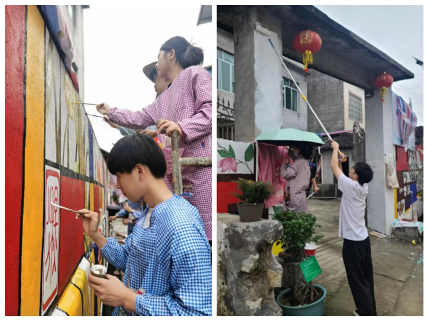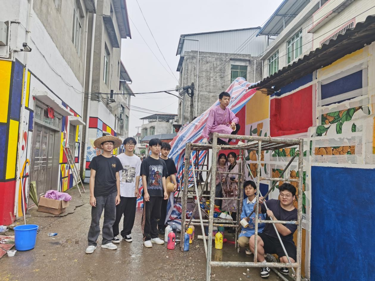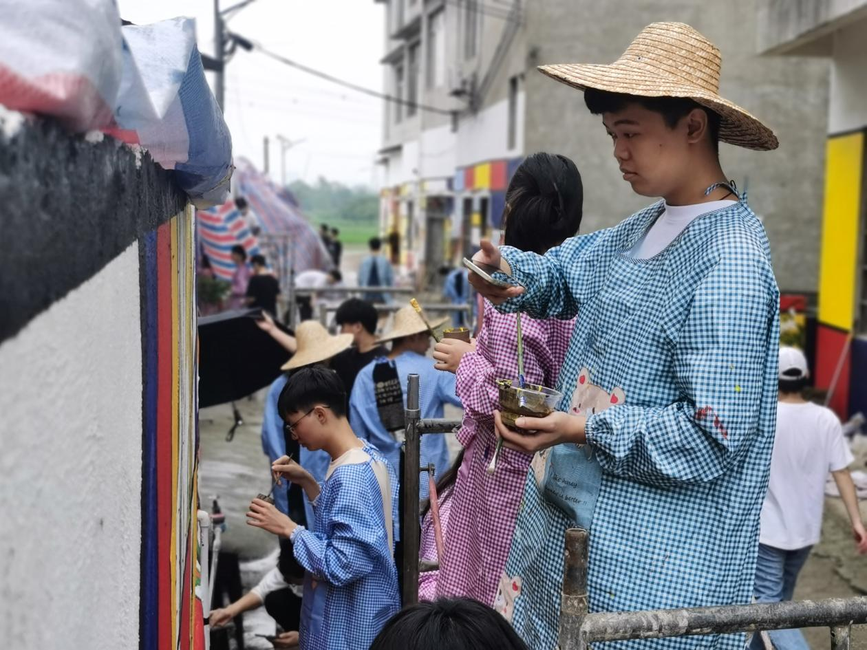 师生们辛勤绘制墙绘