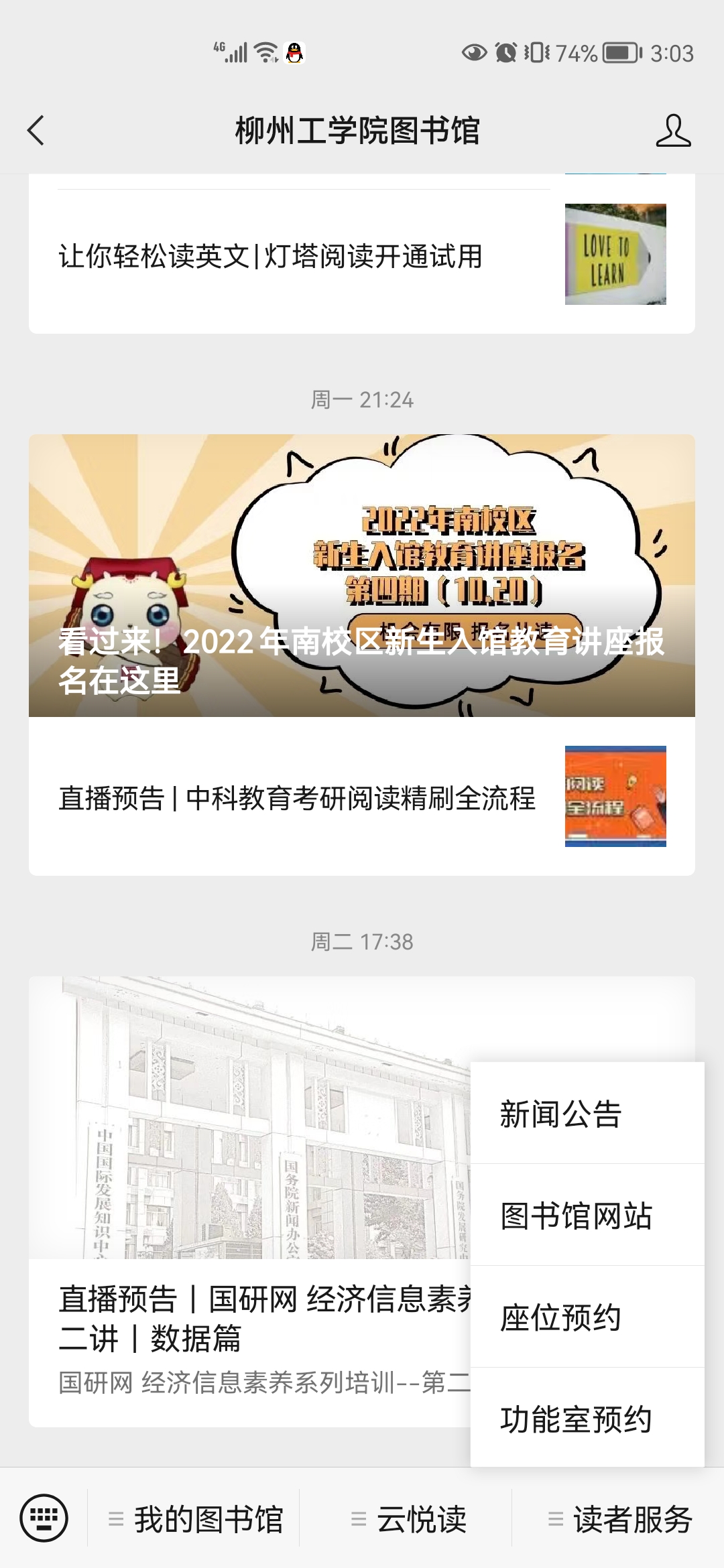 座位预约:座位预约功能,可以预约图书馆阅览座位。