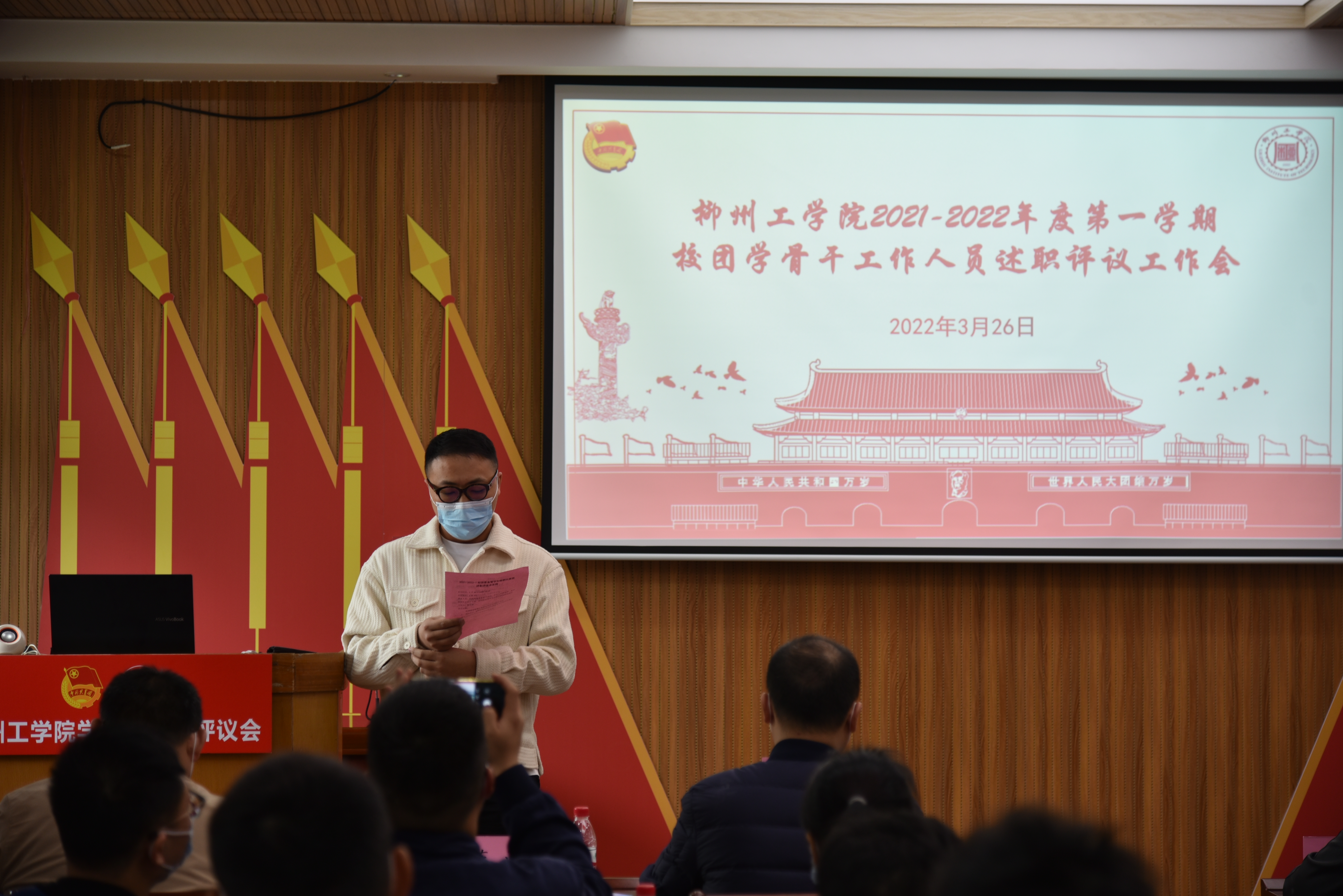 3月26日早上9:00,2021-2022-1开云kaiyun官方网站校团学骨干述职评议会在1教102教室召开,校团委书记洪翠笙、学生工作部综合科科长蒋潮、校团委老师、各二级学院团委书记和各二级学院学生会执行主席出席了此次会议,校团委直管七大组织主席团作工作述职汇报,本次会议由校团委雷世威老师主持。