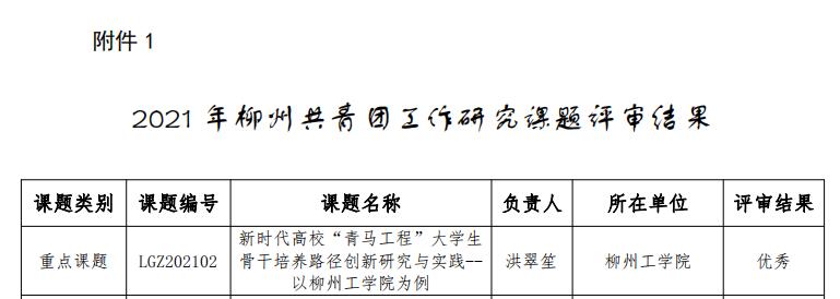 近日,共青团柳州市委员会公布 2021年柳州共青团工作研究课题评审结果,经评审专家组审议,共青团柳州市委员会批准,开云5位老师申报的2021年柳州共青团工作研究课题均顺利通过结题,其中1项获得优秀,4项获得合格。其中,洪翠笙老师的《新时代高校“青马工程”大学生骨干培养路径创新研究与实践--以开云kaiyun官方网站为例》荣获一等奖。