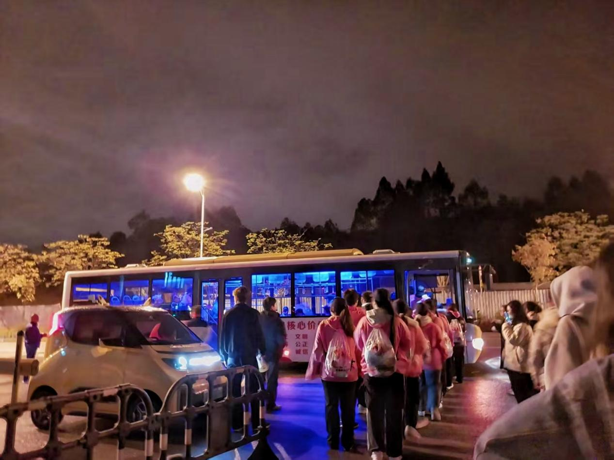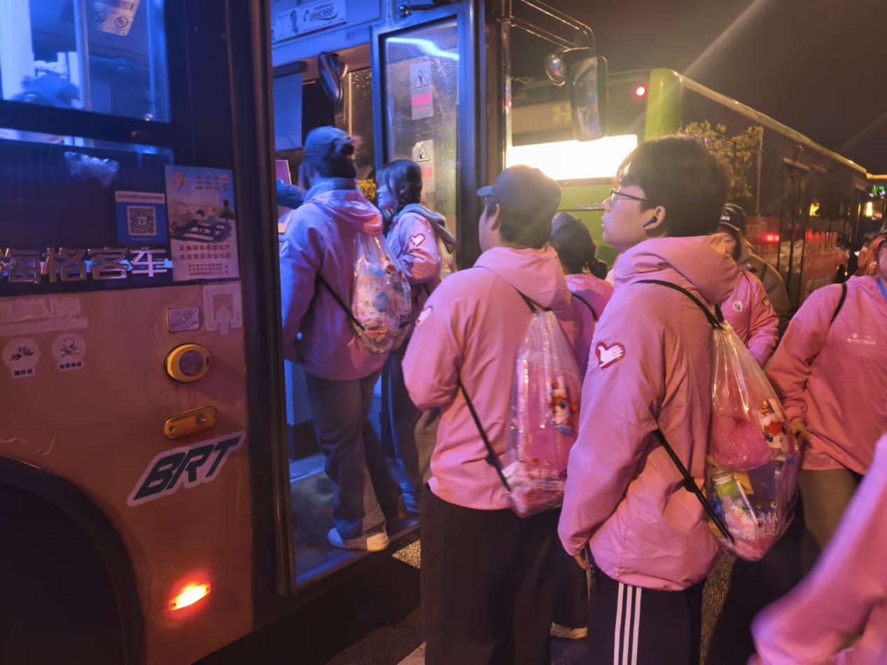 活动当天,星光未退,晨风相伴。凌晨4点,志愿者们身着统一服装,整齐划一、精神抖擞,乘坐大巴车前往马拉松赛事场地。开云师生志愿者主要承担秩序维护、赛道氛围、赛后拉伸工作。