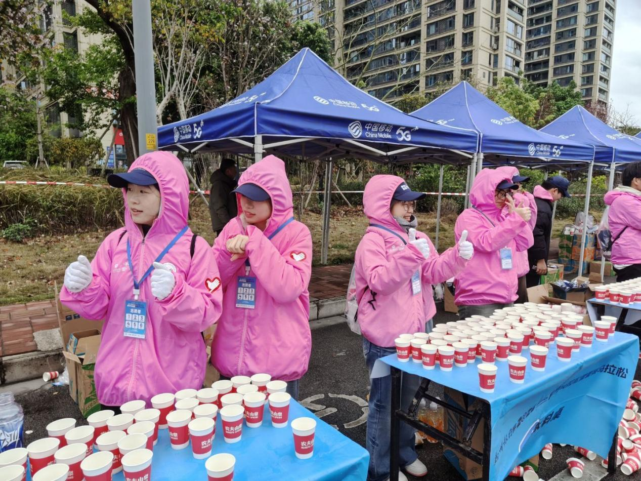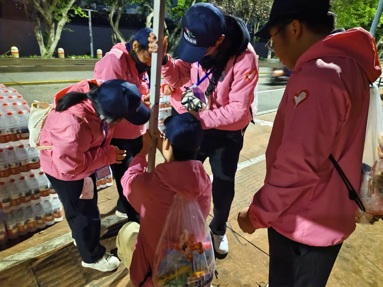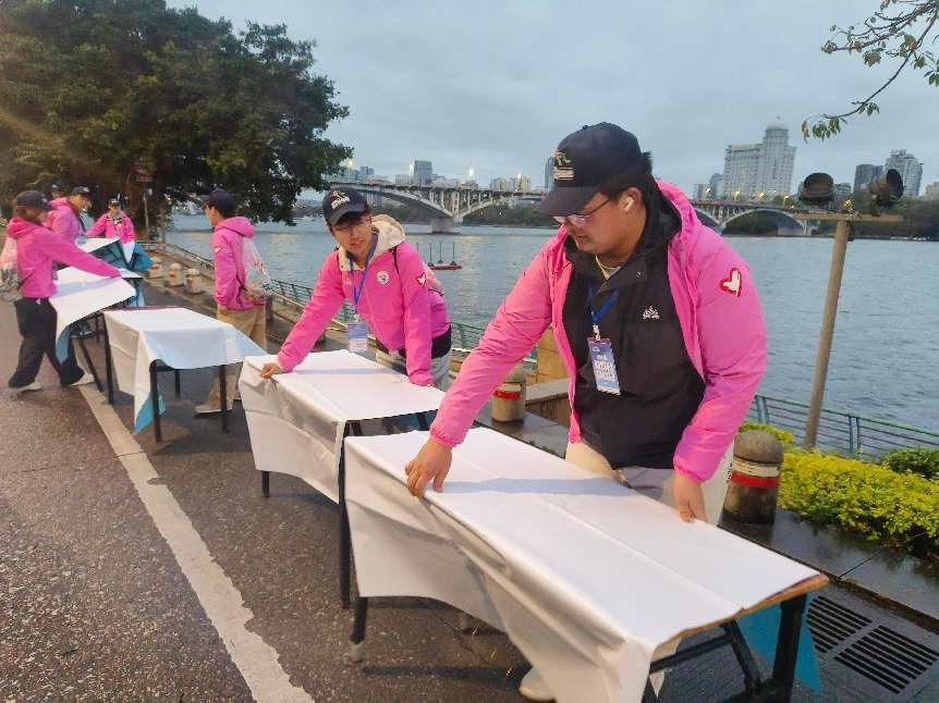 抵达指定路段后,在各负责人组织下,大家迅速分组,分工明确、配合默契。按计划等距离设置了多个补给站,搬水、拿工具、铺桌布、洗水果……各项准备工作有条不紊进行。
