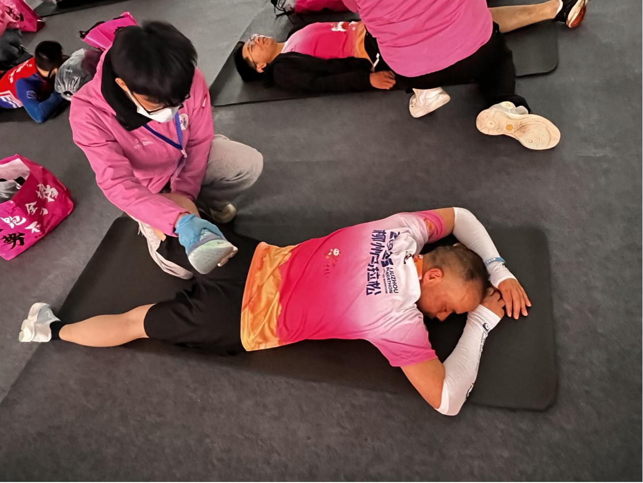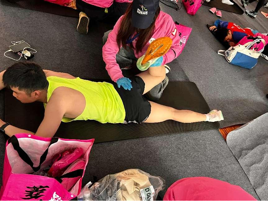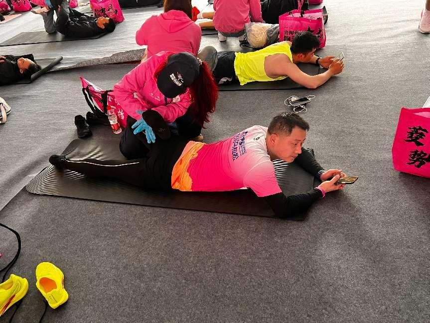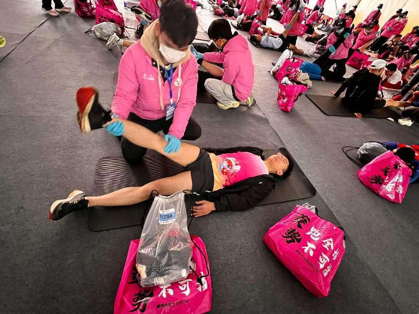 随着参赛选手陆续冲过终点线,在此候场的志愿者立马投入工作,根据每位选手身体状况,运用前期培训的拉伸技巧,帮助参赛者缓解肌肉疲劳,减轻运动后酸痛感。尽管长时间保持弯腰、屈膝动作,但他们始终保持着专注和微笑,用温暖的双手消除疲惫,让参赛者在赛后感受到了贴心的关怀。
