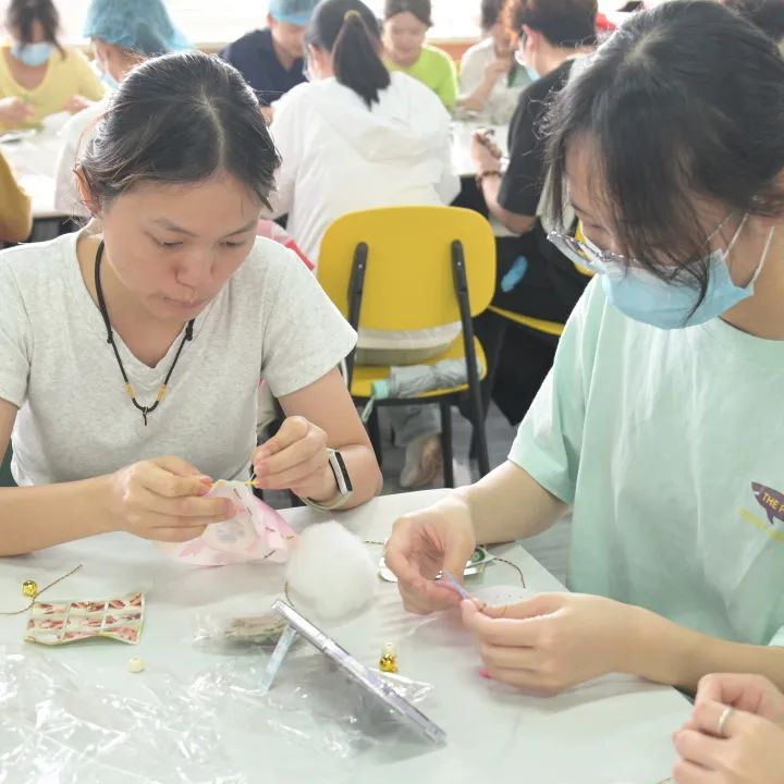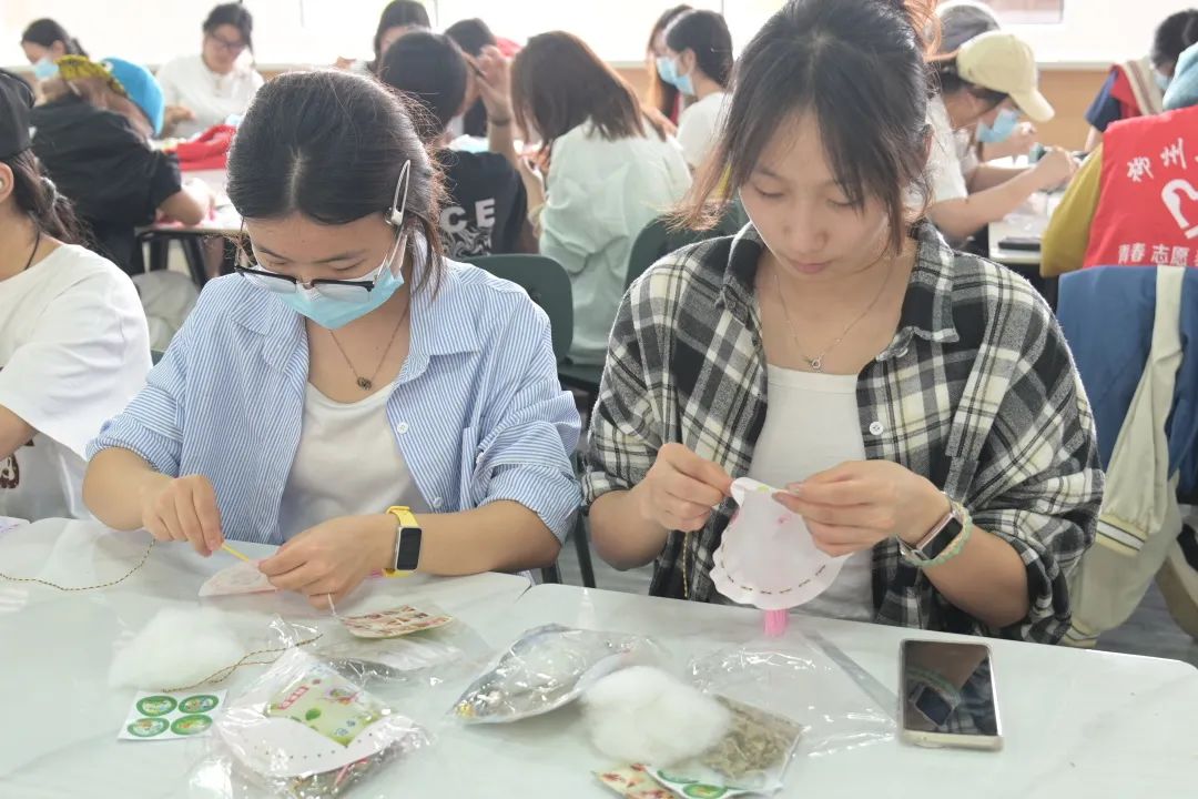 香囊制作区弥漫着艾草与薄荷的清冽气息,彩布材料为活动增添了青春色彩。学生们选取心仪的布料,通过折叠缝合、装饰贴布和流苏等工艺,制作出兼具传统韵味与现代创意的香囊。尽管工艺简约,但药香透过布料散发,体现了“压午驱邪”的传统智慧,进一步加深了学生对传统文化的认同感。