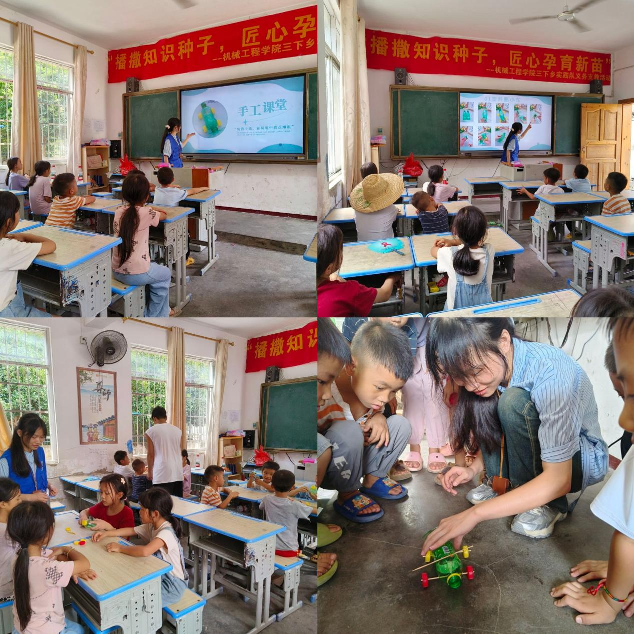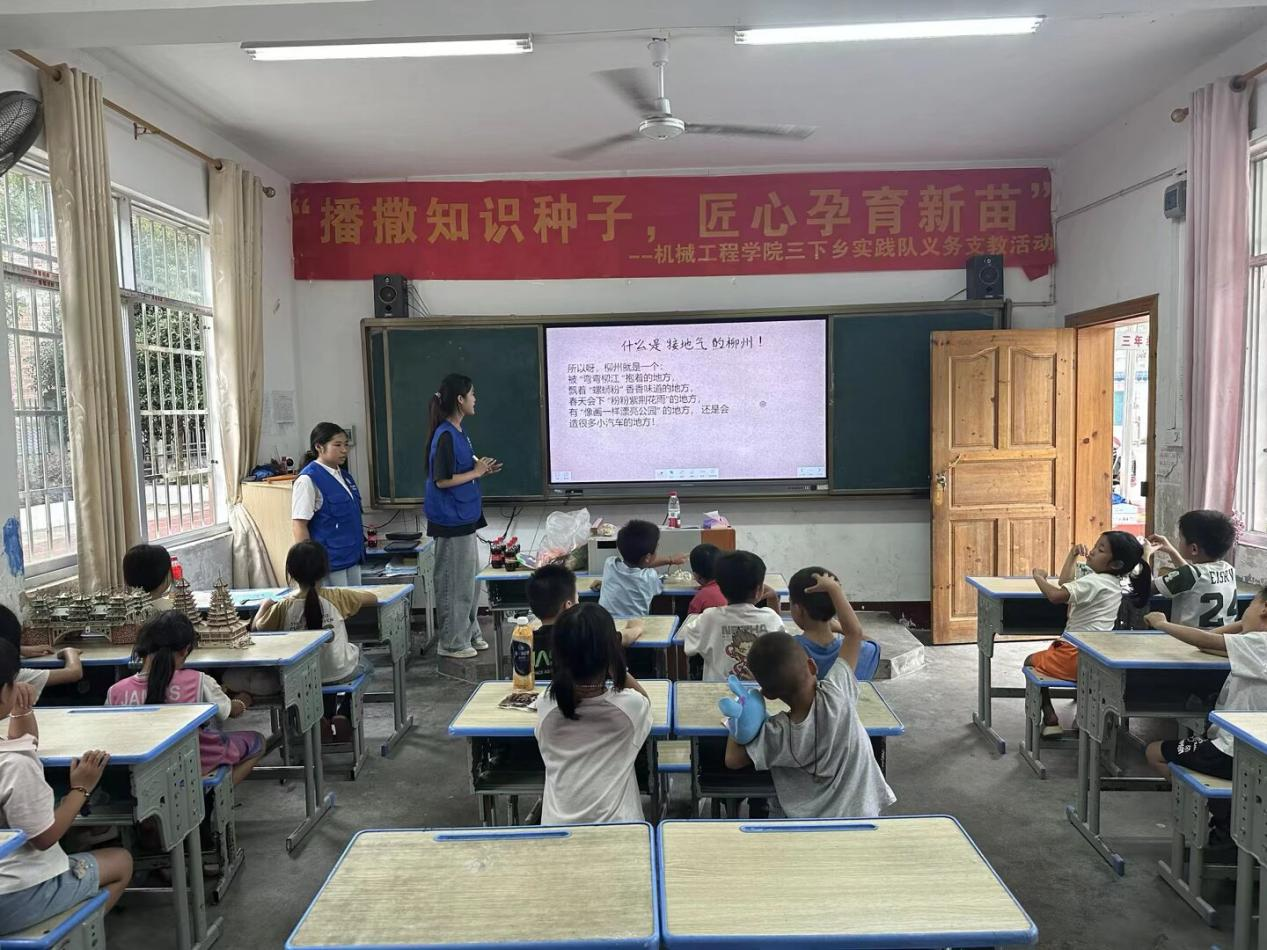 在三下乡社会实践中,机械工程学院师生走进柳州市滚良村小学,以科技与环保融合的生动课堂践行育人使命。通过展示学子自主研发的太阳能动力小汽车,直观传递清洁能源创新应用理念;结合生活场景解析四连杆等机械原理,在乡村孩子心中播撒科学探索的种子;带领孩子们用废弃塑料瓶制作弹力小汽车,将绿色发展理念转化为动手实践,厚植生态环保意识。此次支教活动既是落实科技赋能乡村教育、助力城乡教育均衡发展的具体行动,也是青年学子扎根基层、服务乡村振兴的责任担当,生动诠释了新时代青年以实践行动推动科教兴国与绿色发展战略落地的使命自觉。