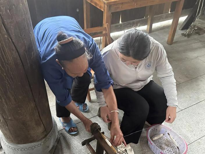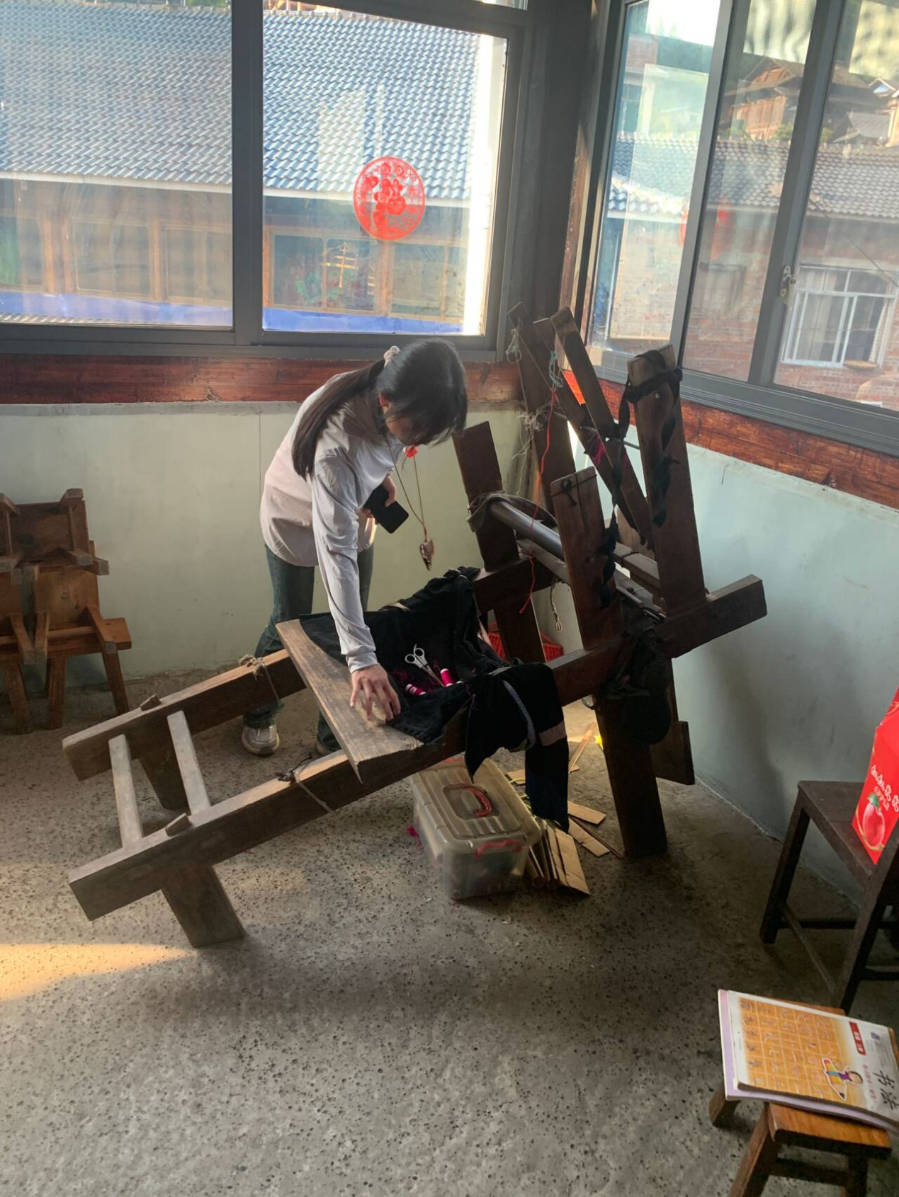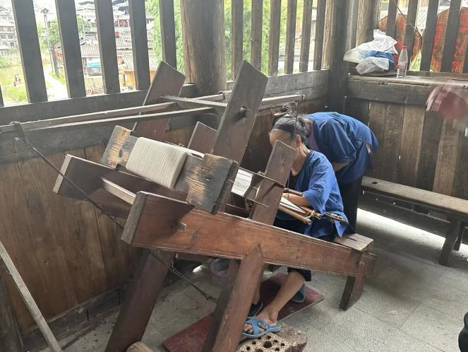 午后,实践团走进程阳八寨,开启传统农具与纺织技艺调研之旅。面对古老的织布机、纺车等农具,团队以机械专业视角解码其中的智慧:通过测绘织布机的传动结构,分析纺车的力学原理,将“就地取材、实用适配”的设计哲学转化为专业学习的鲜活养分。82岁的侗族老匠人指导实践团操作织布机时,木构件的协同运作、手工纺织的工艺细节,让成员们真切触摸到农耕文化的温度。团队不仅完成了对这些农具的测绘建模、建立数字档案,还为传统纺织工具的维修绘制简易图纸,切实解决了传统农具传承中“维修难”的问题。