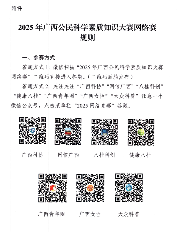 根据《自治区科协等6部门关于举办2025年广西公民科学素质知识大赛的通知》文件,自治区科协,自治区党委网信办自治区科技厅、自治区卫生健康委,共青团广西区委、自治区妇联将于2025年3月至6月开展2025年广西公民科学素质知识大赛。现将通知转发,请各学院鼓励学生扫码参赛。