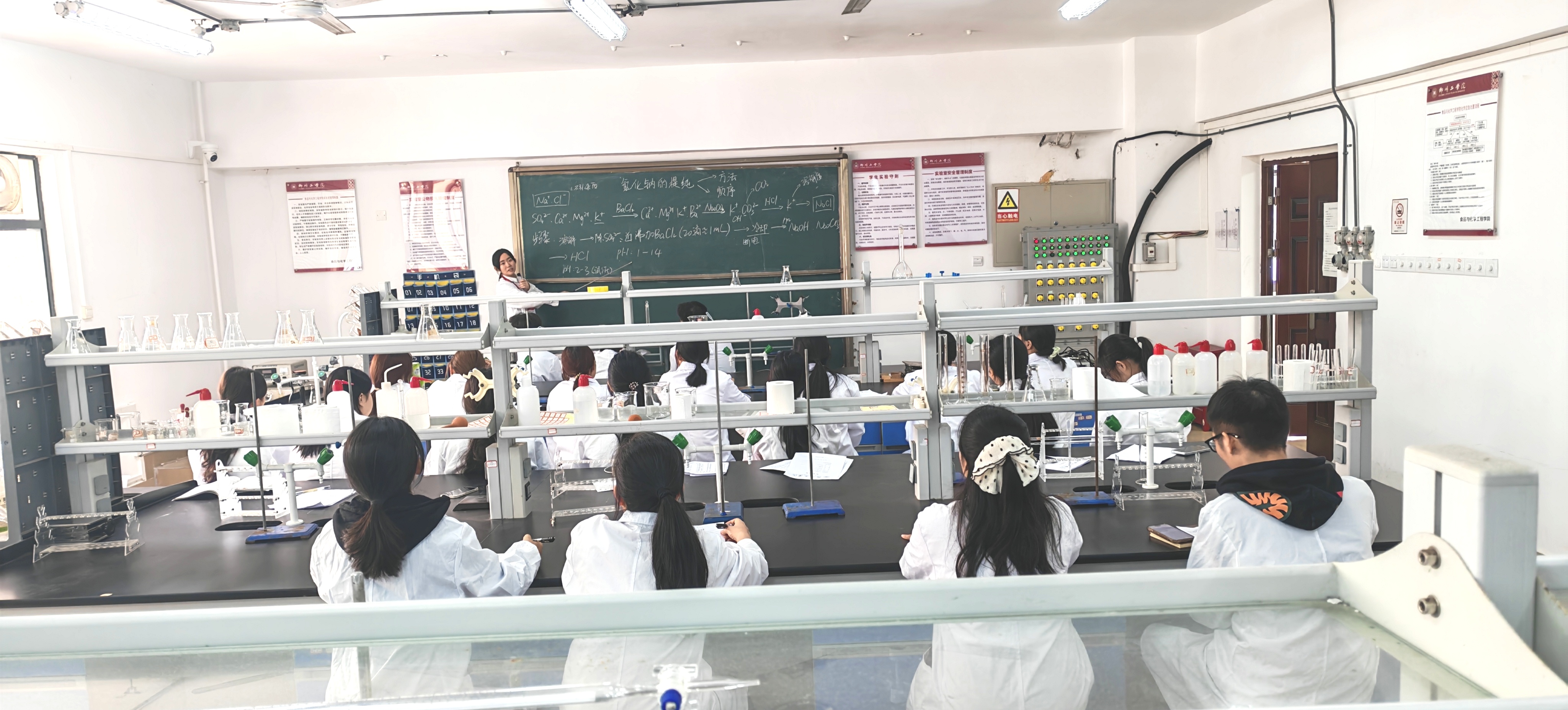 余宛键老师依托扎实专业素养与丰富实验教学经验,以“原理 - 操作 - 安全” 为递进教学逻辑,从氯化钠提纯实验原理切入,拆解操作关键细节、强调安全注意事项,还通过板书呈现离子反应方程式、分步除杂方法等核心知识点,将抽象原理转化为直观内容,助力学生理解实验逻辑、掌握操作要点。实验操作环节,身着实验服的学生热情探究:紧跟老师思路记录要点、主动思考实验原理;实操时规范操作仪器、细致观察实验现象,遇疑问及时交流。课堂既严谨规范,又充满师生、生生互动的探索活力,凸显《无机及分析化学实验》对学生实操能力与科学思维的培养目标。