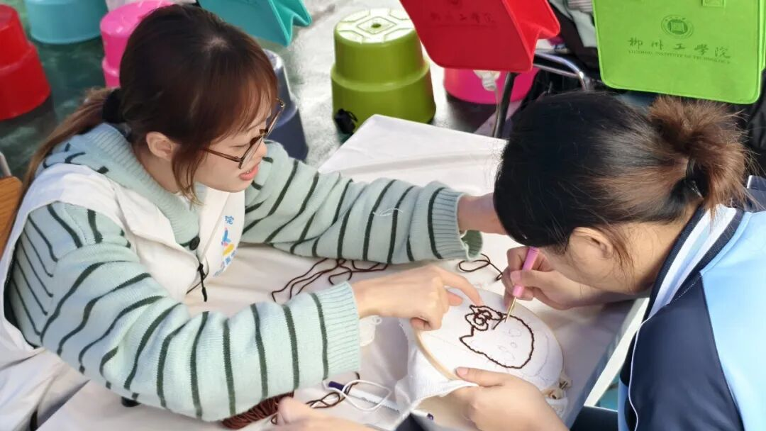 展示现场,社团成员着装整齐、举止文明,化身“非遗文化讲解员”,向参会嘉宾细致介绍“设计-培训-生产”的助农闭环模式,讲解苗族纹样与簇绒工艺的创新融合思路。不少嘉宾驻足体验簇绒基础技艺,在动手实践中感受非遗魅力与德育温度,对社团以专业所长助力文化传承、服务乡村振兴的举措给予高度评价。
