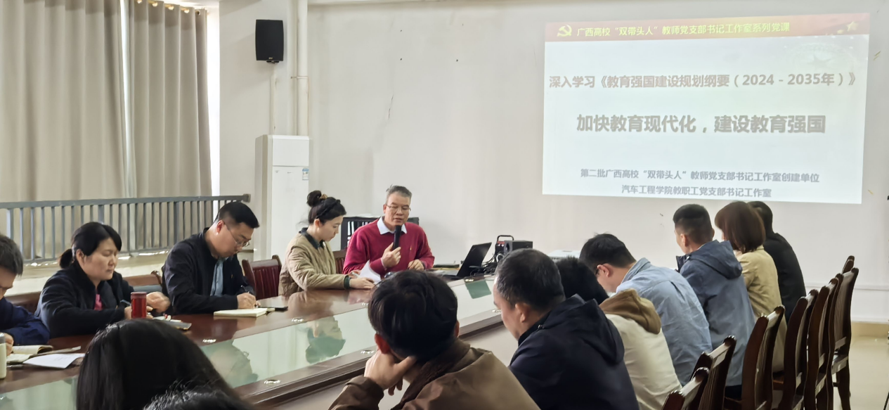 会议伊始,支部书记何川带领全体党员深入学习2025年全国两会精神,重点解读了政府工作报告中有关科技创新、人才培养等内容,鼓励党员教师将2025年全国两会精神融入日常教学与科研工作中,为汽车产业的发展培养更多优秀人才。