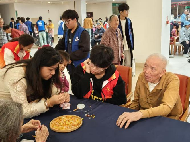 活动以重阳节集市为核心载体,围绕“让长者欢聚、享阳光生活”的目标设计多个环节。在“物物交换”集市中,学院的志愿者们提前准备水果、生活用品串珠手工材料等,长者可通过活动积分兑换心仪物品。同时,现场活动设置串珠、猜字谜、健康知识问答等环节,拉近志愿者与长者的距离,让老人们感受到乐趣,现场笑声不断。随后,志愿者们主动陪长者聊天,不仅帮助长者放松心情,更传递出“夕阳西下,也要阳光生活”的积极理念,让敬老爱老的温暖直抵人心。