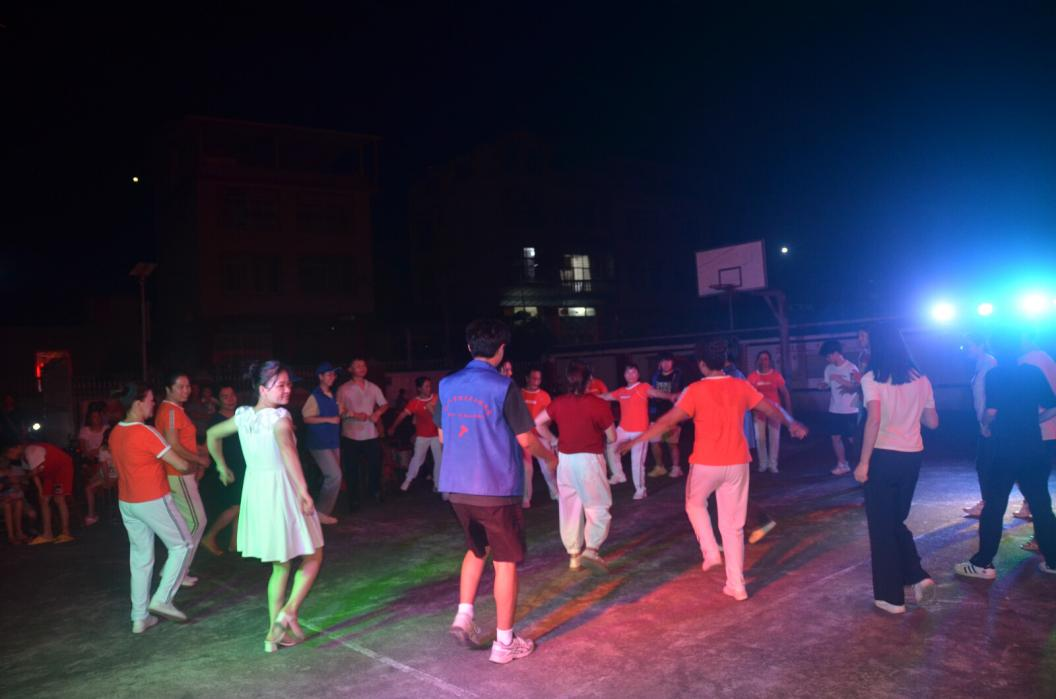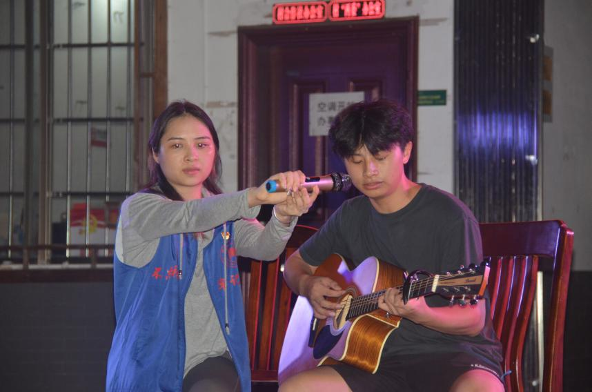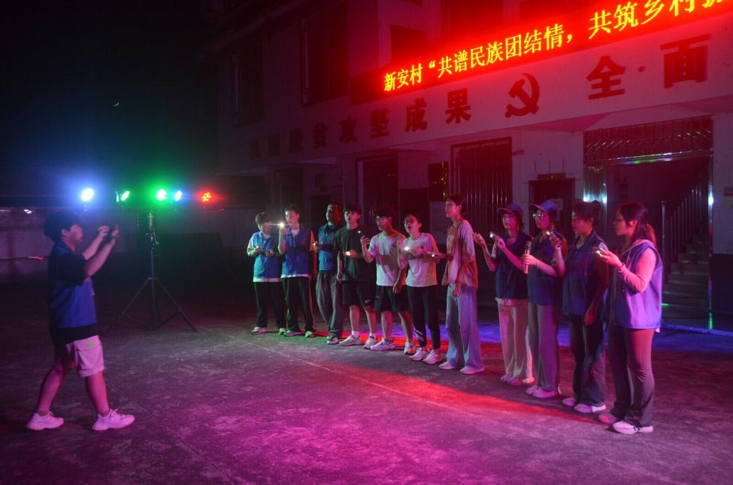 7月8日晚20时,新安村“共谱民族团结情,共筑乡村振兴梦”主题文艺晚会在村委会举行,现场热闹非凡,人头攒动。晚会开场由魏钱树同学带来吉他独奏《蓝莲花》,村民们在魏钱树同学的吟唱中感受到了当代青年大学生的朝气蓬勃。随后,实践队员与两位指导教师合唱的《平凡之路》获得在场观众频频叫好。接着,实践队员与当地少数民族村民围成圆圈共舞,一起舞动民族旋律,舞出文化自信,共绘出一幅民族团结的美丽画卷。此次文艺晚会的顺利开展,不仅表示了村委对全体实践队员的热烈欢迎,而且极大地丰富了当地村民的精神文化生活。