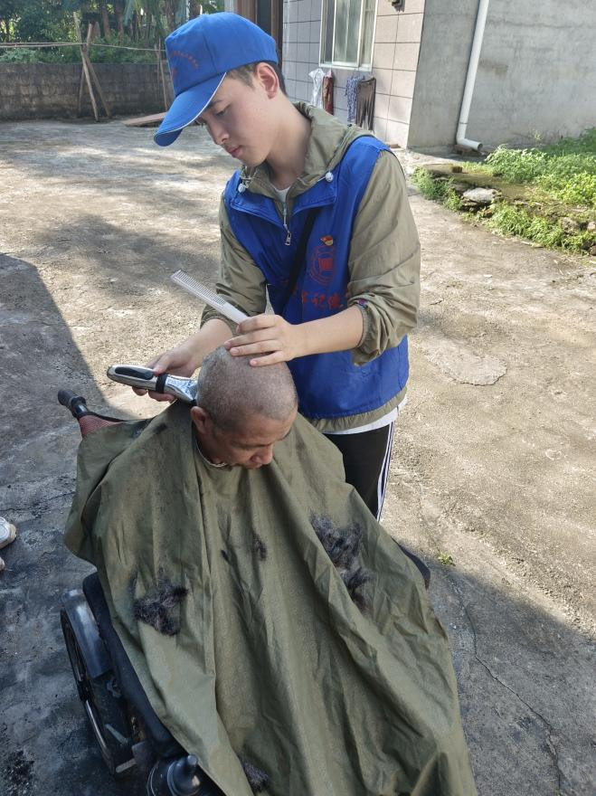 7月7日下午,全体实践队员开展义剪活动。义剪对象多为本地留守老人和腿脚不方便的残障人士。杨俊豪同学拿起美发剪与剃子,手起发落,还老人一头清爽,也让老人们感受到了陪伴的温暖。