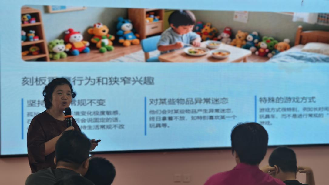 星语康复训练中心彭年秀主任带来孤独症知识科普,从儿童行为特点、沟通方式等角度展开讲解。志愿者们认真聆听,深入理解“星星的孩子”的独特需求。