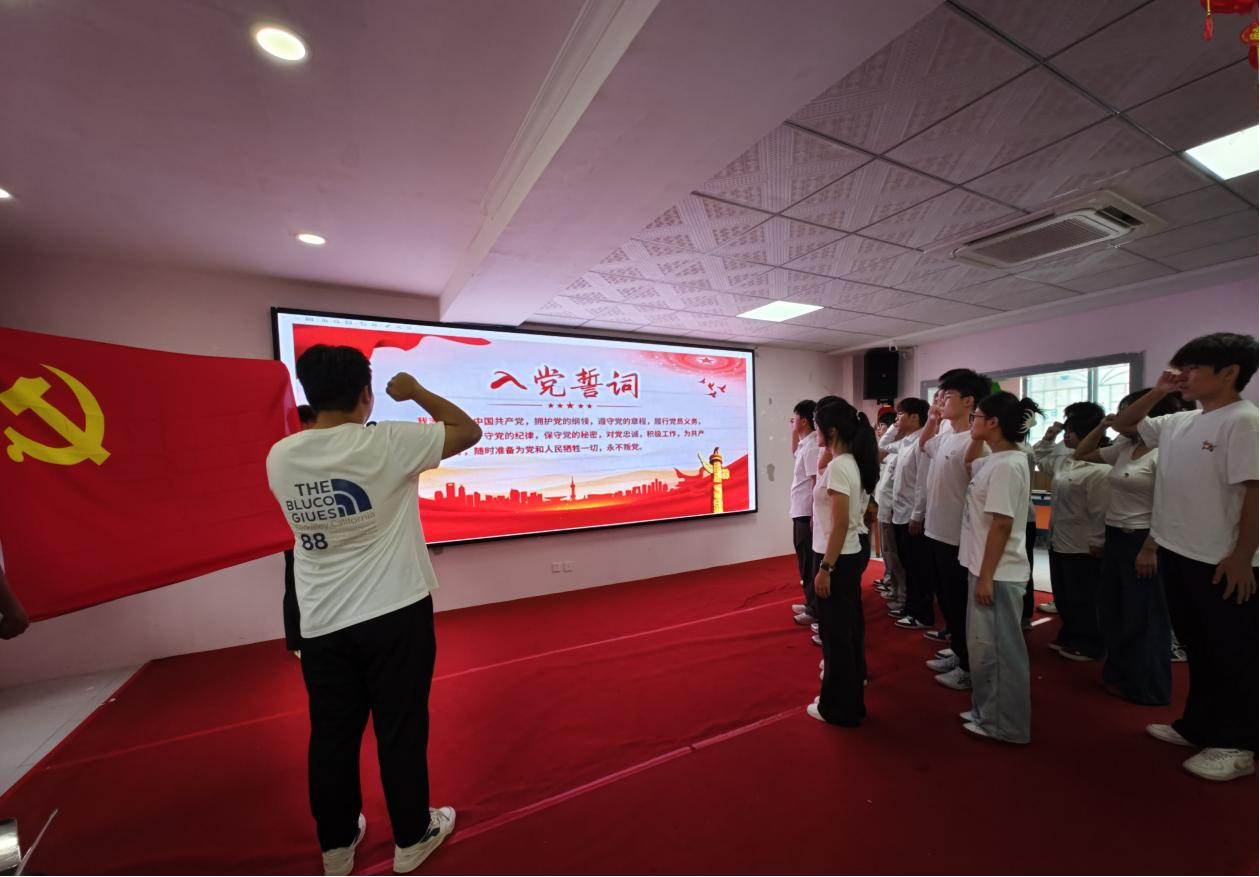 活动现场还设置了新发展党员入党宣誓环节。在学院学生第二党支部李奎源同学的领誓下,我院24名新发展党员面向鲜红的党旗,举起右拳庄严宣誓:“我志愿加入中国共产党,拥护党的纲领,遵守党的章程……”铿锵有力的誓言响彻活动现场,既是对党的庄严承诺,也标志着他们正式肩负起党员的责任与担当。