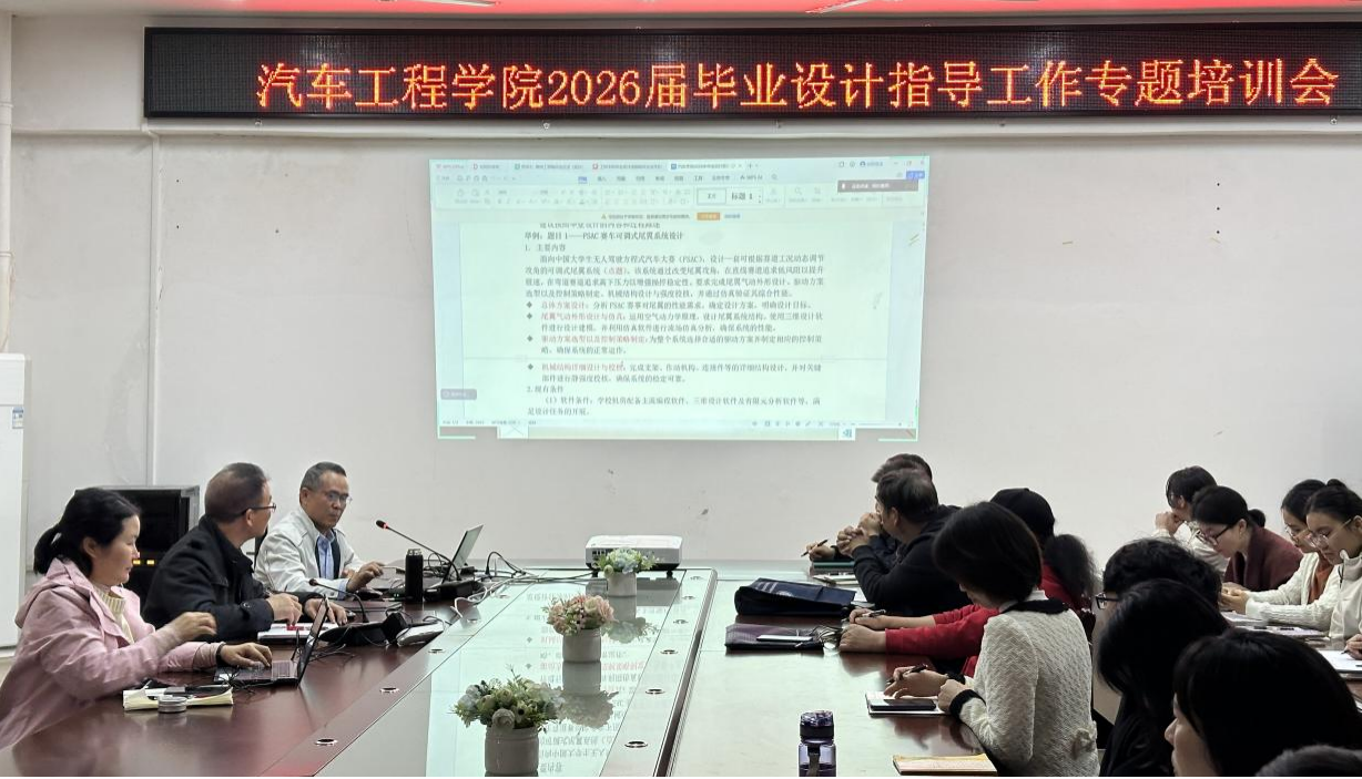 本次专题培训是汽车工程学院夯实人才培养基础、强化教学质量提升的重要体现。学院通过抓牢毕业设计的选题与任务规划,致力构建“高标准设计——全过程指导——高质量产出”的教学闭环,持续优化学风教风与育人生态。学院将以此为契机,进一步推动工程教育与实践教学深度融合,为培育契合汽车产业发展需求、具备扎实工程素养与创新能力的应用型人才奠定坚实基础。