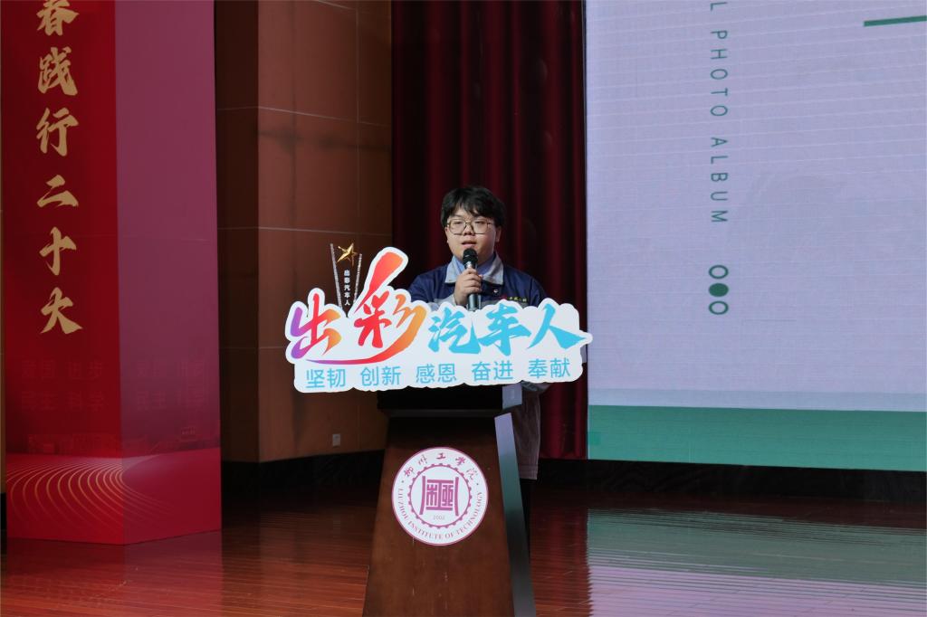 第二幕“初心——履践致远”由传承人刘佳豪宣读出彩汽车人传承词《履践致远》。勇当先锋、勇挑重担,是中国青年的鲜明特质,是新时代中国青年的时代风采。刘佳豪在传承词里提到:汽车人要有“舍我其谁,奋勇当先”的冲劲,找准自己的价值坐标,或将科技创新付诸实践,亦或把他助升华为互助。新时代汽车人,须在担当中历练、在尽责中成长。