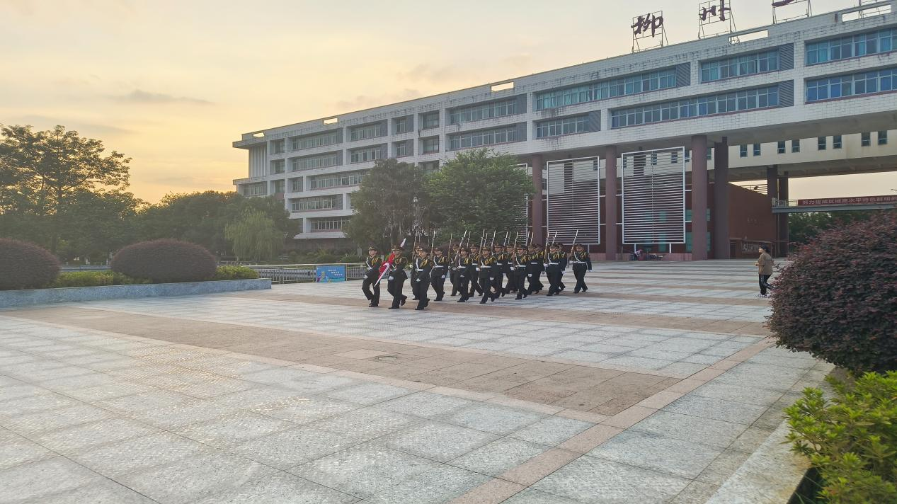 伴随着初升的朝阳,国旗班的脚步铿锵有力,全体师生行注目礼,五星红旗在嘹亮的国歌声中冉冉升起。