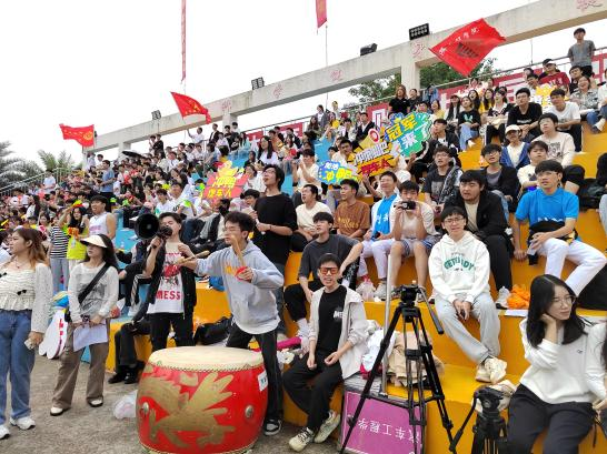 运动健儿们在赛场上奋力拼搏,观众们在观众台为他们呐喊助威。