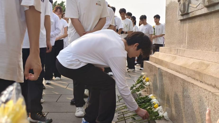 在苍松翠柏环绕的烈士纪念广场上,全体团员佩戴团徽,整齐列队,肃立于革命烈士纪念碑前。团员代表向烈士敬献花篮,全体成员默哀三分钟,深切缅怀为民族独立和国家富强英勇献身的英雄先烈。随后,新发展的团员们依次将手中的白菊敬献于纪念碑基座,朵朵鲜花承载着新时代青年对先烈的无限追思。