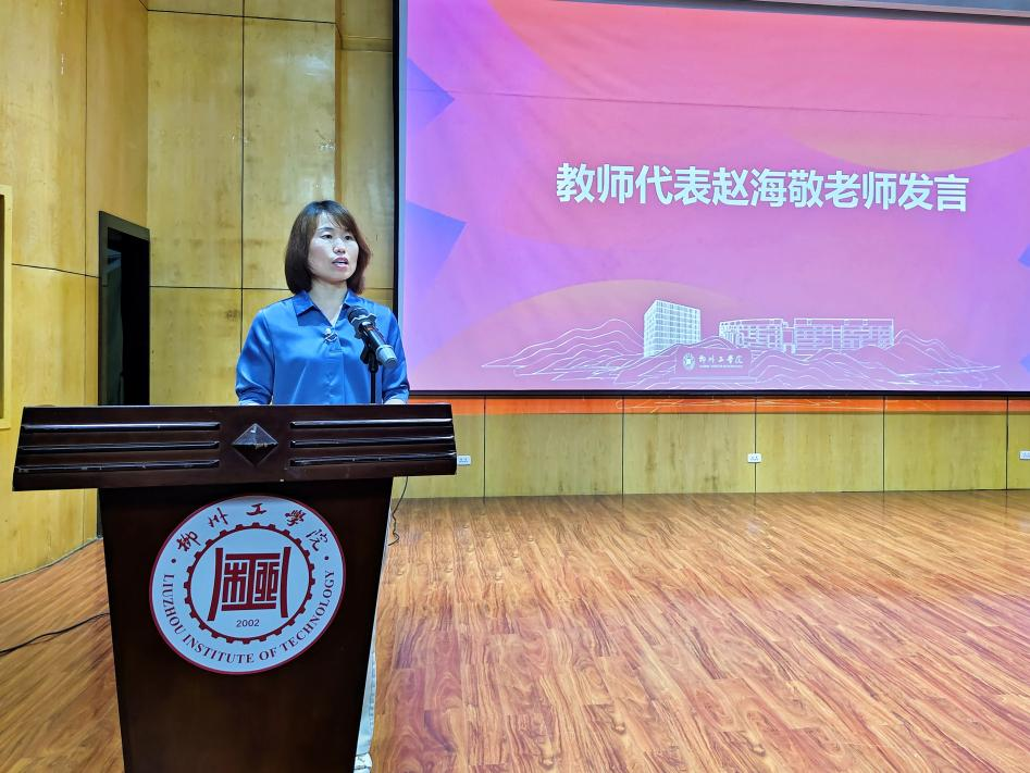 教师代表、院长助理赵海敬发言。她强调,优良学风是成才之基、强院之本,同学们要珍惜韶华,志存高远,将个人发展融入国家汽车工业进步浪潮,在严谨求实的氛围中锤炼扎实本领,并承诺全体教师将尽职尽责,做好学生的引路人和同行者。