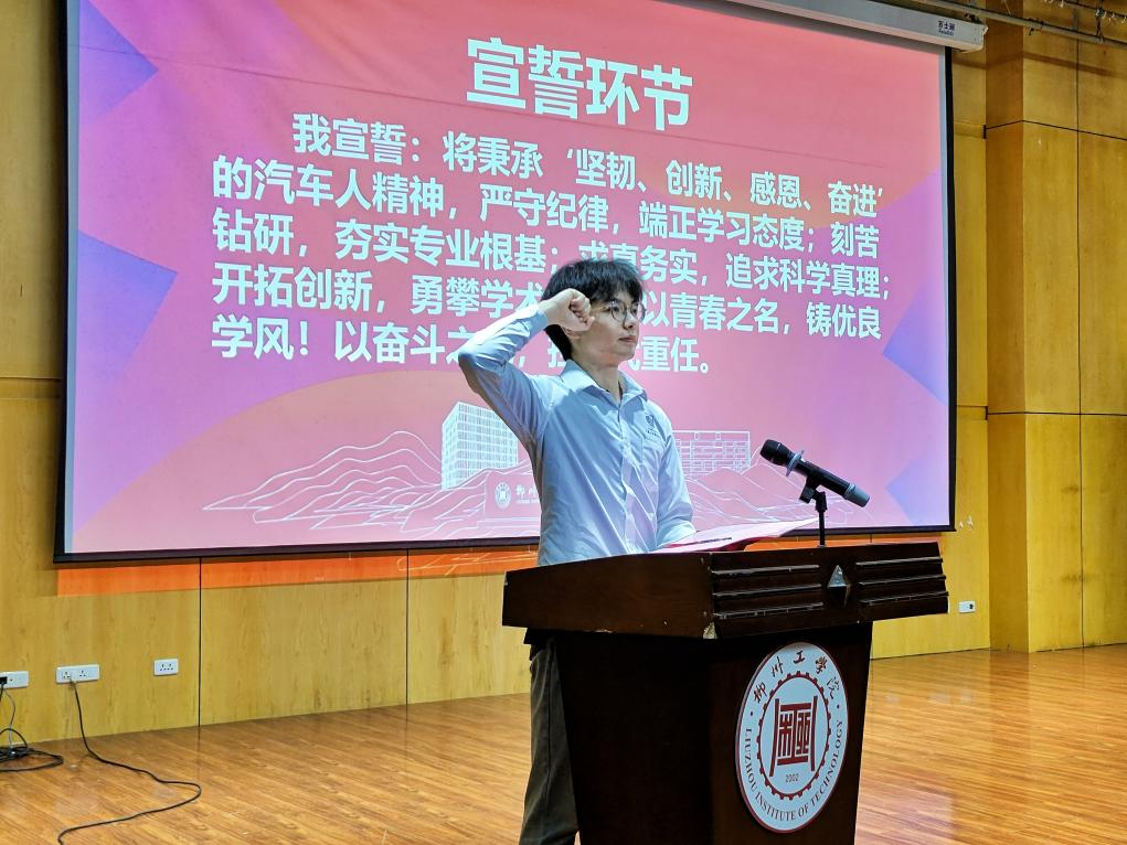 宣誓环节中,在领誓人的带领下,全体学生肃然起立,高举右拳,发出铿锵誓言,誓言响彻会场,彰显了汽车学子立志勤学、奋发图强的坚定信念。