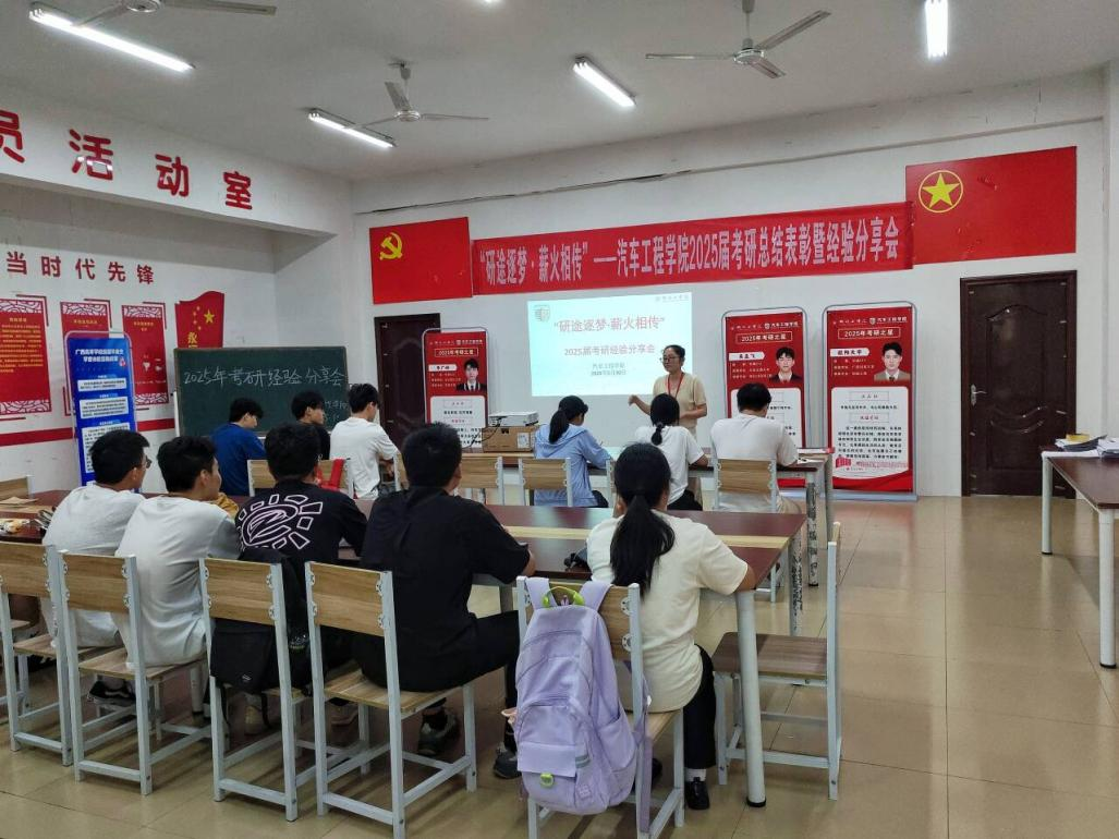 为帮助考研学子明晰考研方向,掌握科学备考方法,增强考研信心,2025年5月30日下午,汽车工程学院于南校区第三实训楼226党团活动室成功举办2025届考研经验分享会。活动特邀2021级3位成功考取硕士研究生的学长分享备考经验。团委指导教师韦石华、2022级辅导员廖燕、2022级考研学生代表参加活动。