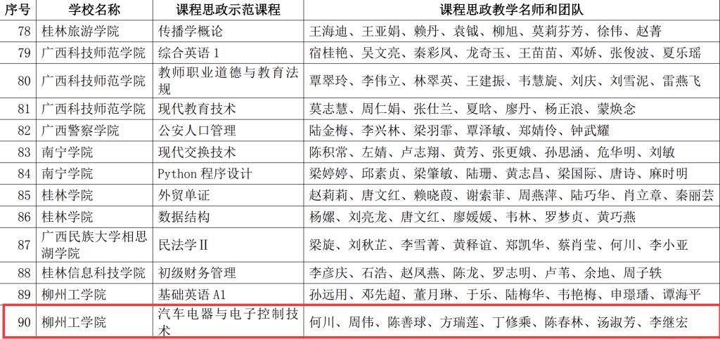 在《自治区教育厅关于公布2022年普通本科高校课程思政示范课程名单的通知》(桂教高教〔2022〕52号)中,我院《汽车电器与电子控制技术》课程获批“2022年自治区级普通本科高校课程思政示范课程”,课程授课教师和教学团队同时被认定为“自治区级课程思政教学名师和团队”。
