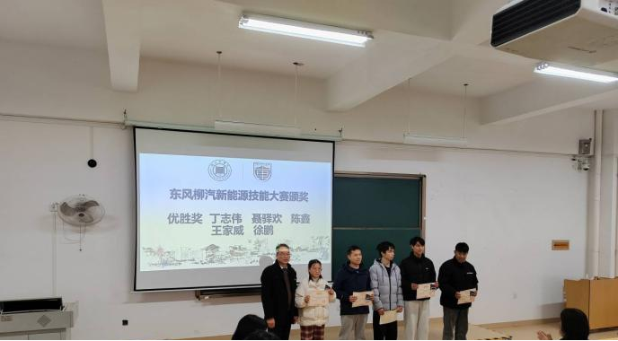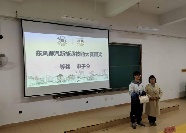 东风柳汽新能源汽车技能大赛开云获奖选手上台领奖,车辆224班申子仝作为获奖学生代表分享参赛心得。