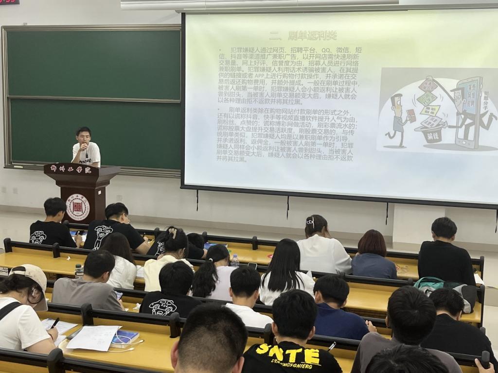 (宣讲人卿权正在为同学们讲解诈骗事件)