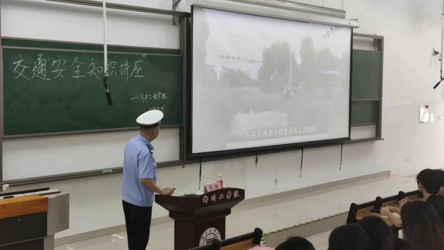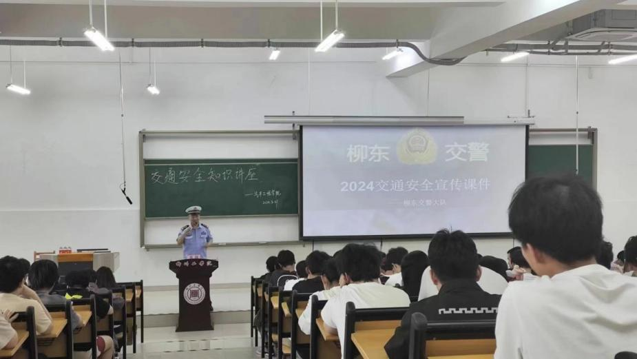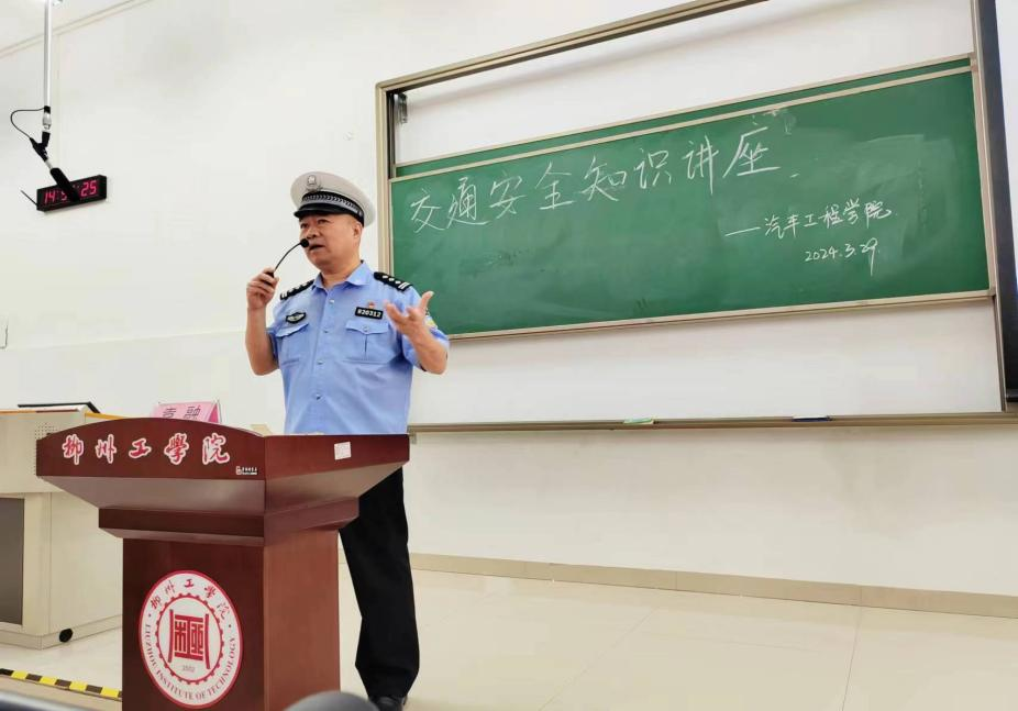 为进一步落实学院交通安全宣传教育,增强广大师生的交通安全意识,全力预防和减少交通安全事故的发生,2024年3月29日下午,汽车工程学院于北校区T1-103举办以“守护出行,共创平安”为主题的交通安全知识讲座。本次讲座由柳东交警大队袁融警官主讲。