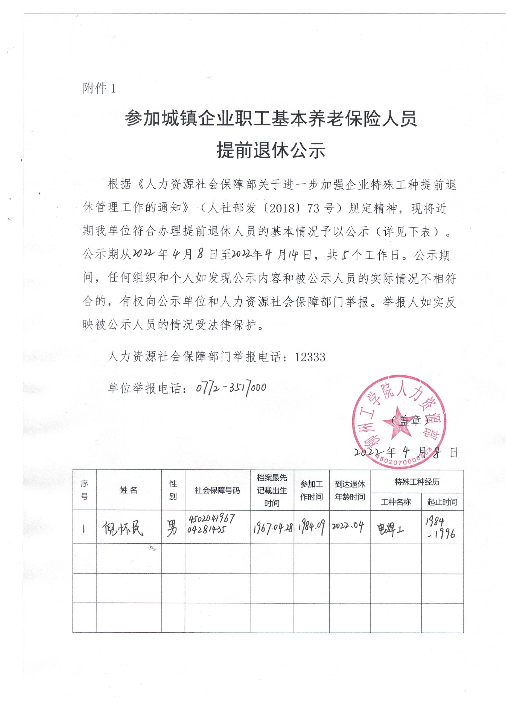 2022年4月参加城镇企业职工基本养老保险人员提前退休公示
