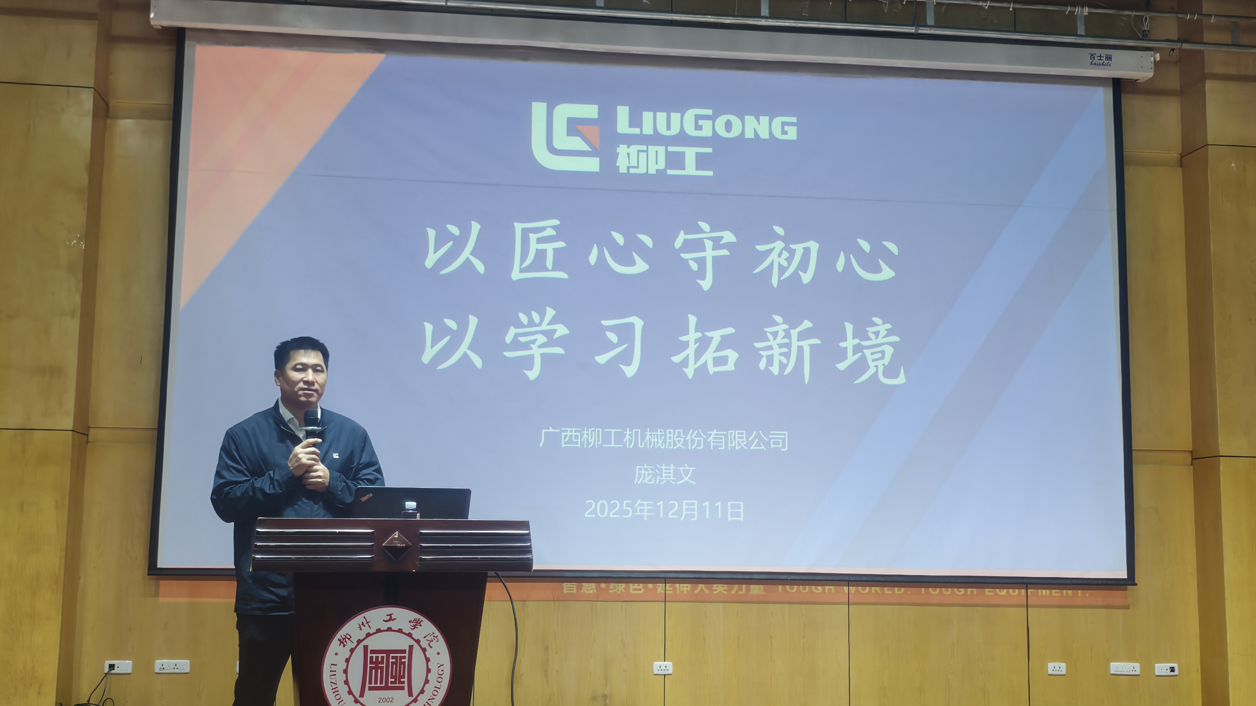 围绕柳工在绿色智能转型中的实践,庞淇文展示了企业电动挖掘机、装载机等环保高效产品的优势,以及自主可控的核心零部件传动系统解决方案。他结合新时代产业工人成长通道,强调了“精技能、懂技术、能管理、会创新、善育人”的复合型人才培养目标,鼓励青年学子既要扎根专业打磨过硬本领,也要保持终身学习的进取心态,在实践中创新突破。