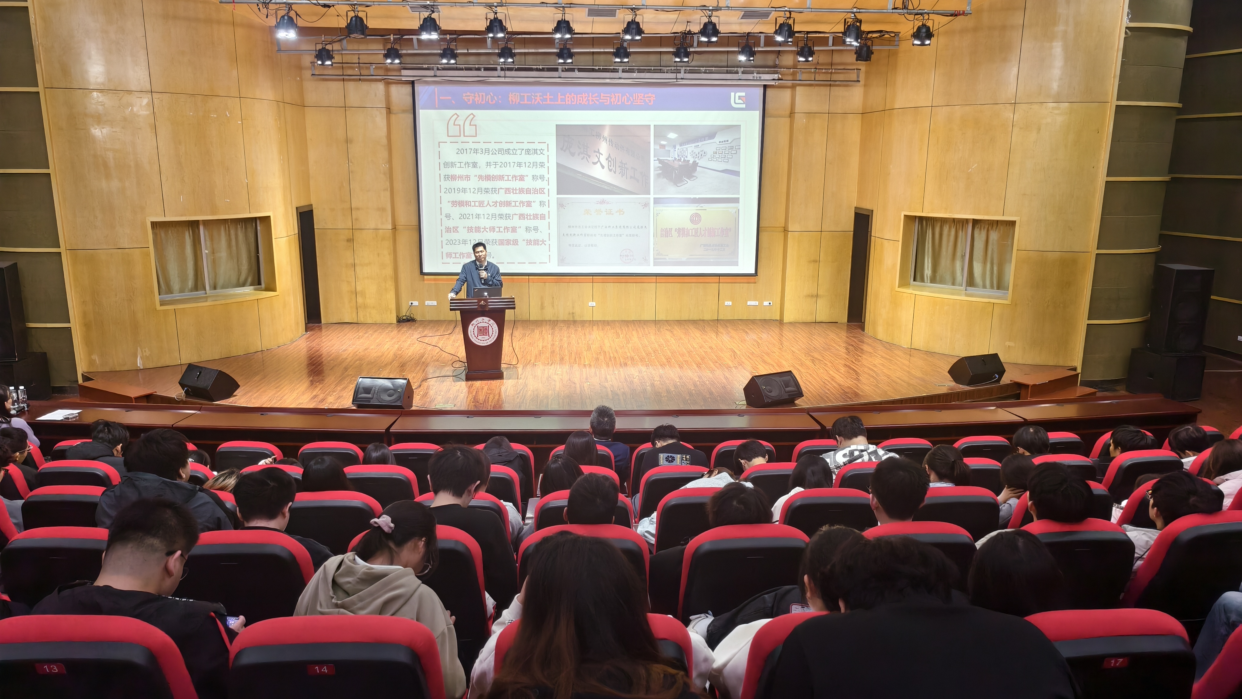 讲座中,庞淇文结合自身成长历程,生动讲述了从一名数控加工中心操作员到特级技师、制造总监的奋斗故事。他分享了2011年入职柳工后,在岗位上深耕不辍,通过参与各级技能竞赛锤炼技艺,先后斩获全国数控技能大赛奖项、广西五一劳动奖章等诸多荣誉的经历。同时,他详细介绍了所带领的创新工作室从市级到国家级的发展历程,以及在技术改造、设备修复、人才培养等方面取得的丰硕成果,让师生直观感受“执着专注、精益求精、一丝不苟、追求卓越”的工匠精神。