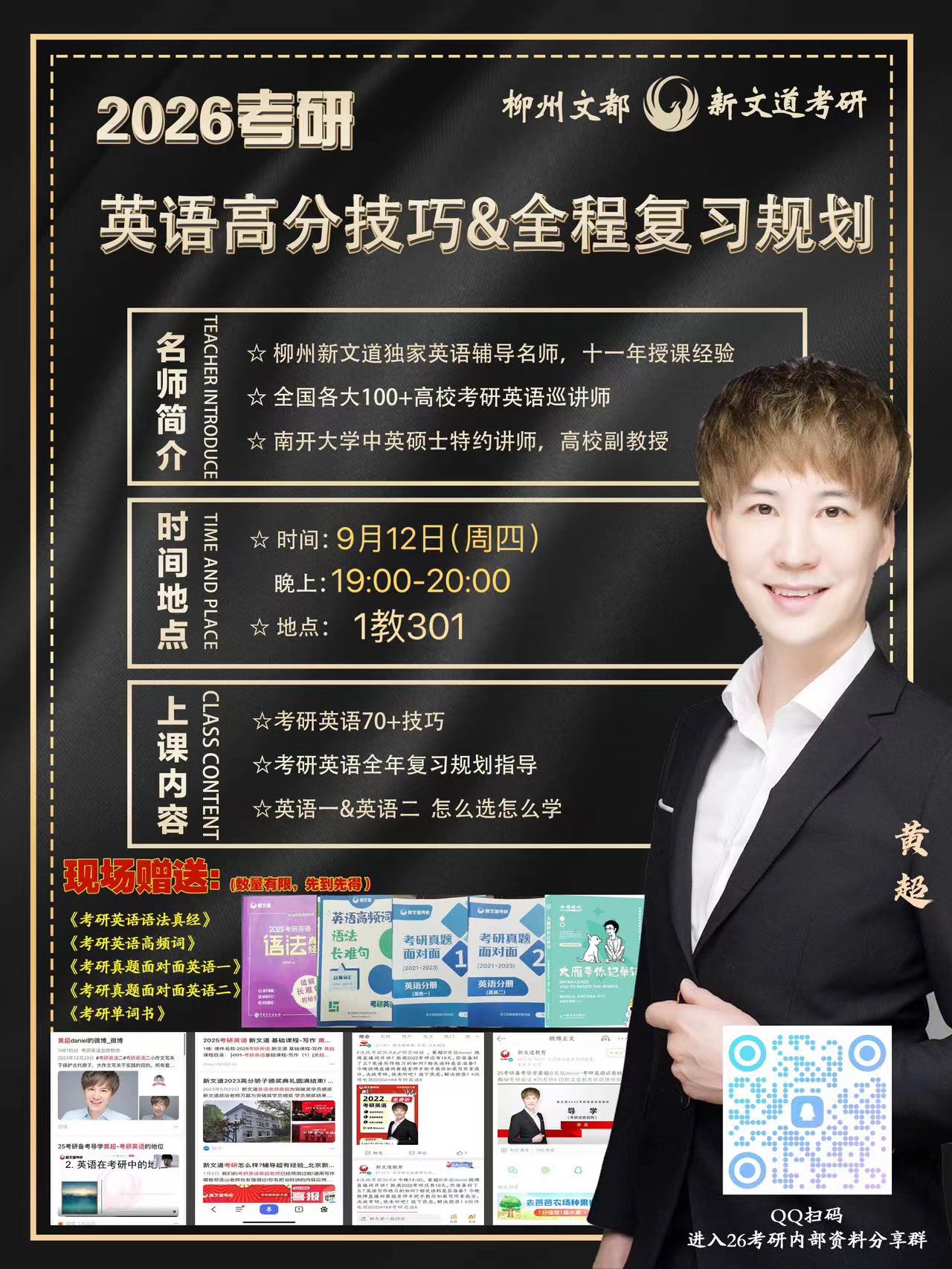 讲座于9月12日(周四)晚上 19:00 - 20:00,在开云kaiyun官方网站1教301教室准时开讲。主讲人为黄超老师,他是柳州新文道独家英语辅导名师,拥有十一年授课经验,作为全国各大100 + 高校考研英语巡讲师,同时也是南开大学中英硕士特约讲师、高校副教授。