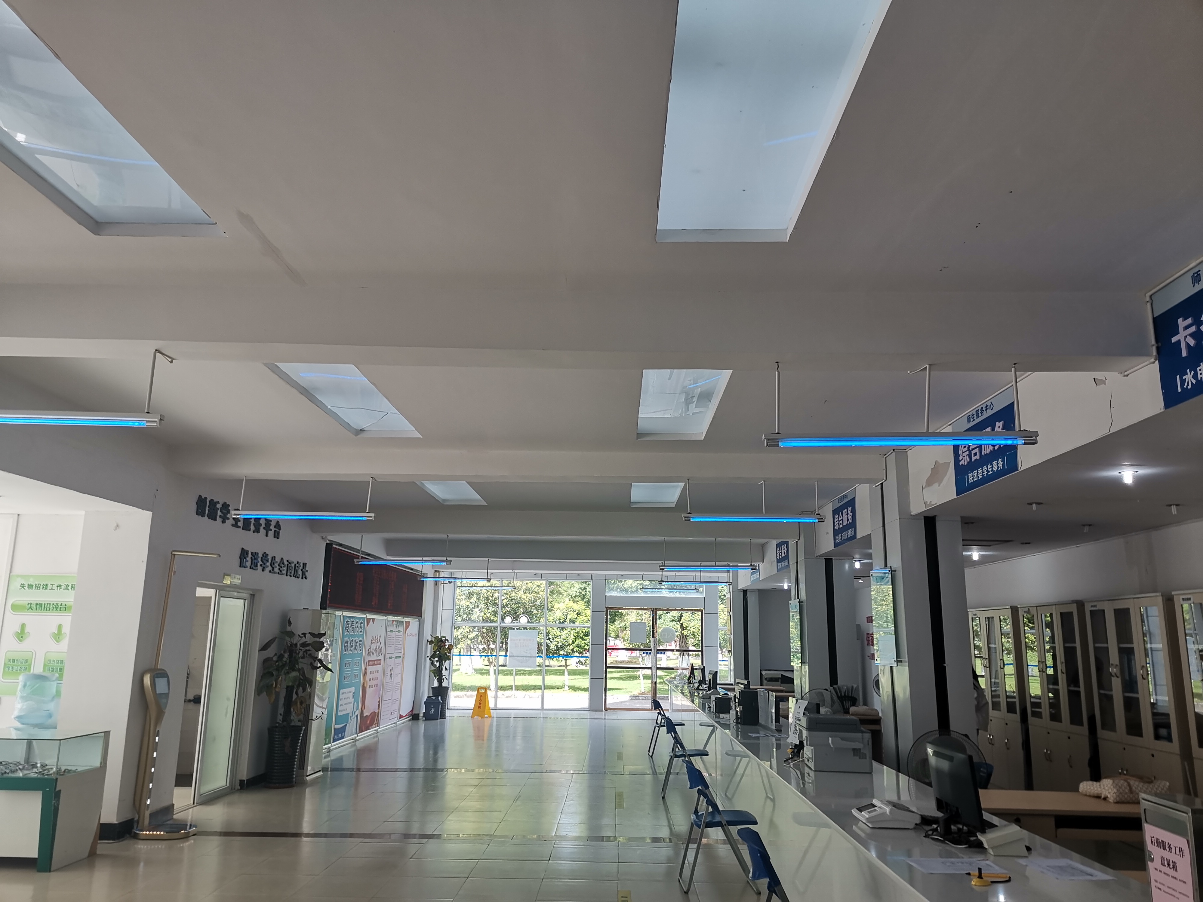 近期,师生服务中心在大厅区域安装12支紫外杀菌灯管,进一步织密疫情防控网,为师生健康保驾护航。