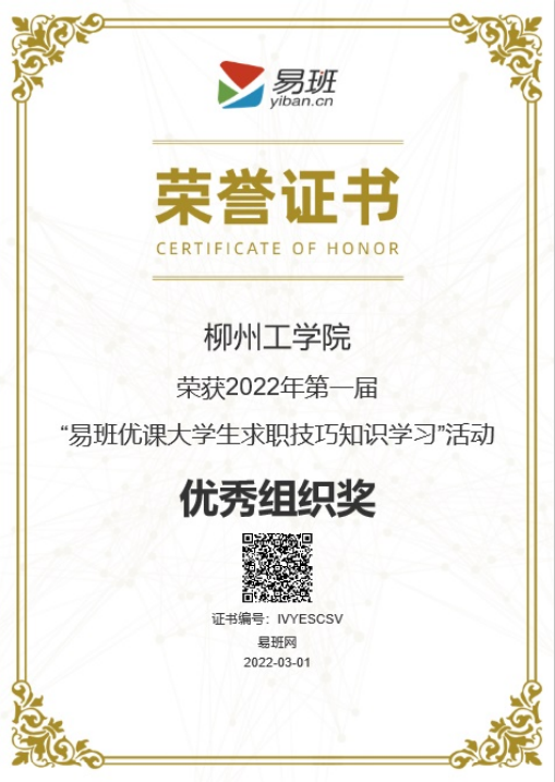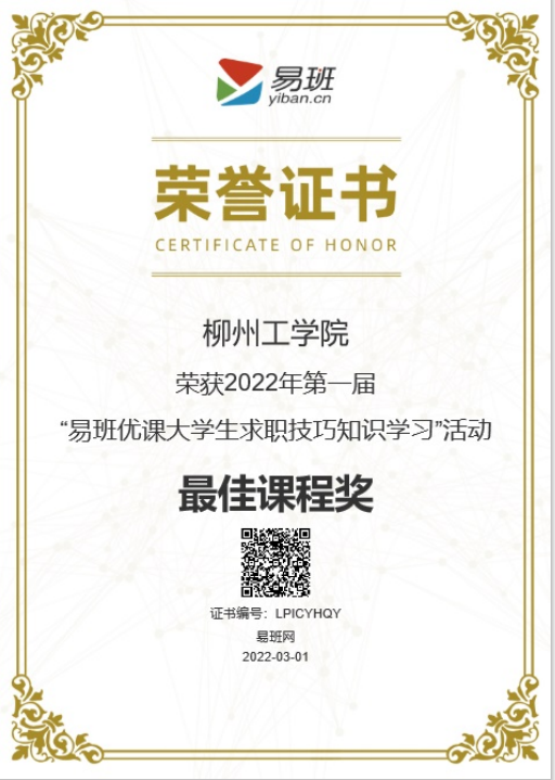 2022年3月,荣获第一届易班优课大学生求职技巧知识学习活动优秀组织奖、最佳课程奖;