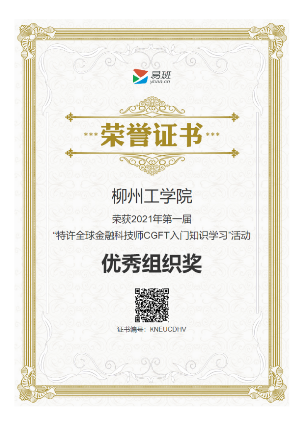 2021年7月,荣获第一届特许全球金融科技是CGFT入门知识学习活动“优秀组织奖”(全国三十所高校、广西三所高校之一);