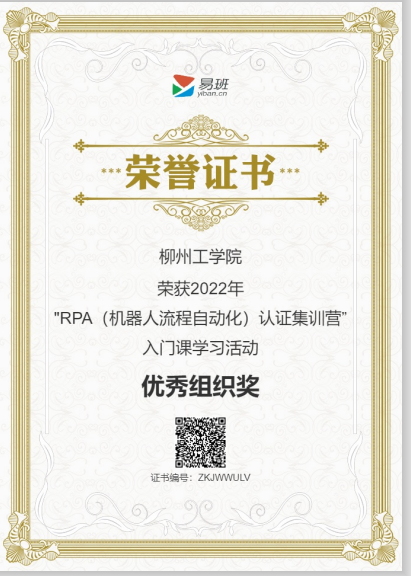 2022年5月,荣获“RPA(机器人流程自动化)认证集训营”入门课学习活动优秀组织奖‘’