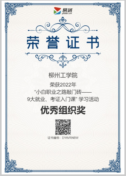 2022年5月,荣获“小白职业之路敲门砖(9大就业、考证入门课” 学习活动)优秀组织奖;
